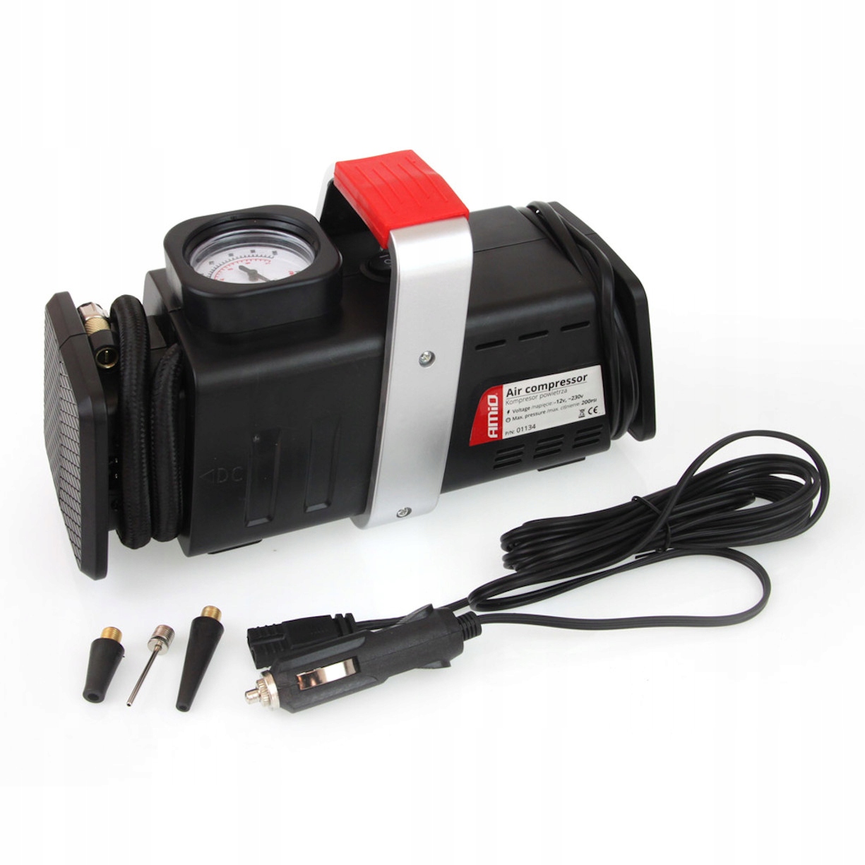 Компрессор имеет два шнура питания (230 В переменного тока) длиной 1,8 м и еще один дополнительный шнур питания (12 В постоянного тока) длиной 3 м. В комплект также входит напорный шланг длиной 55 см с резьбовым наконечником для накачивания колес автомобилей и автомобилей. мотоциклы.