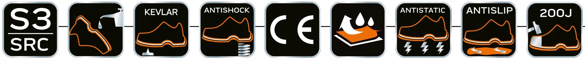 обувь имеет двухматериальную подошвуи высокую устойчивость к маслам, бензину и другим органическим растворителям. Они обеспечивают антиэлектростатические свойства и защищают пальцы от ударов с энергией до 200 Дж. более того, они характеризуются устойчивостью к скольжению на керамической подложке, покрытой раствором лаурилсульфата натрия (SLS) и стальной подложке, покрытой глицерином.