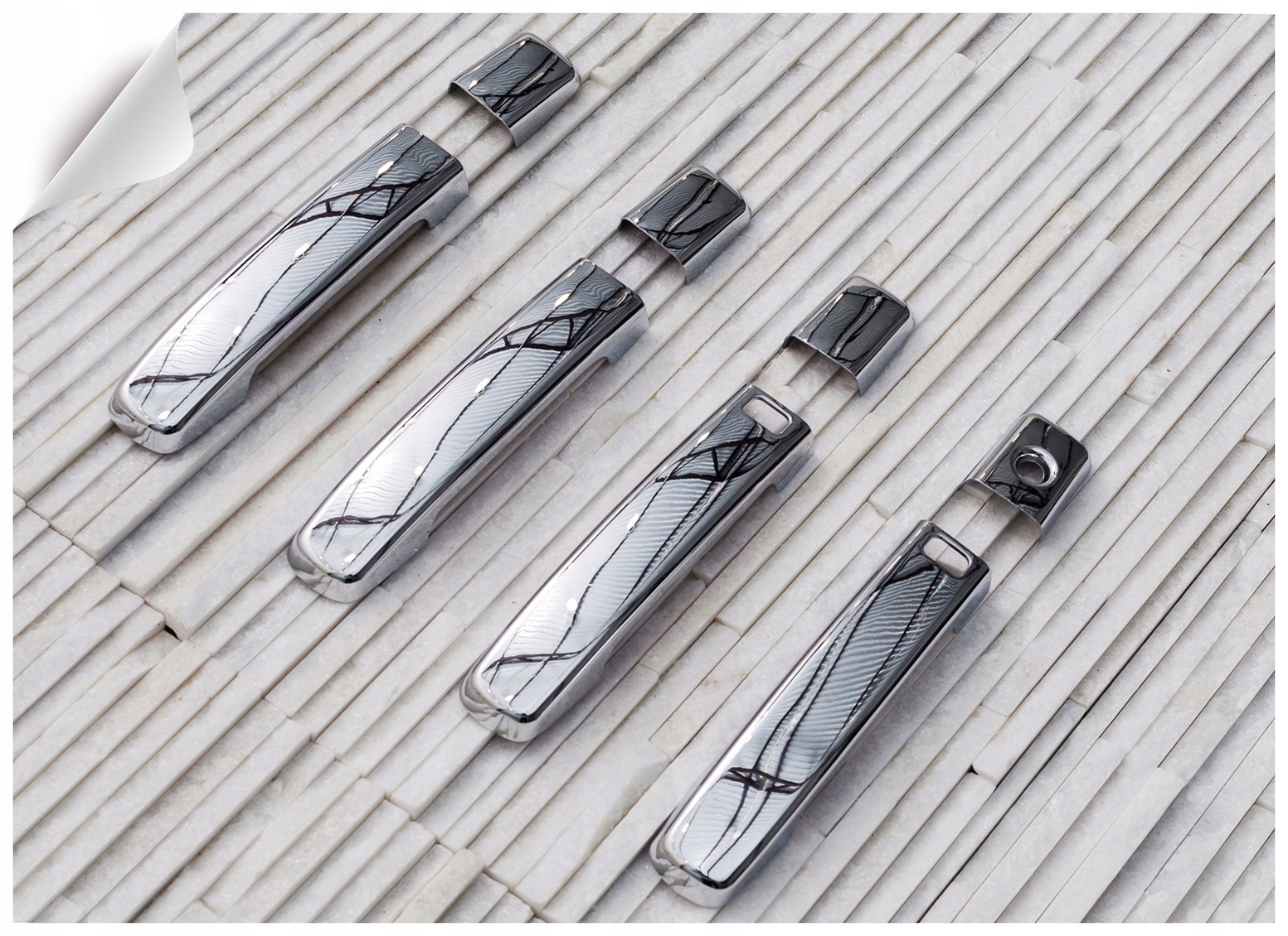 эти элементы изготовлены из высококачественного хромированного АБС-пластика. Простая и безопасная установка, ее можно сделать самостоятельно. Накладки монтируются с помощью двусторонней клейкой ленты Scotch 3M, нанесенной на внутреннюю сторону. Их следует наносить на обезжиренную поверхность с помощью экстрактивного бензина или спирта при положительных температурах от 18 ° C. В комплекте набор из четырех накладок на дверные ручки (под датчик).
