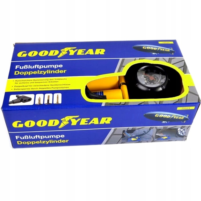 Универсальный автомобильный ножной насос GOODYEAR + переходники. Фирменный продукт, 2 перекачивающих поршня, нескользящие ножки, точный, хорошо читаемый манометр, макс. давление 7 бар, прост в использовании. Двойная головка для различных клапанов, небольшой размер в сложенном состоянии для хранения. Для накачивания автомобильных, мотоциклетных, велосипедных покрышек, понтонов, воздушных шаров, мячей, надувных матрасов.