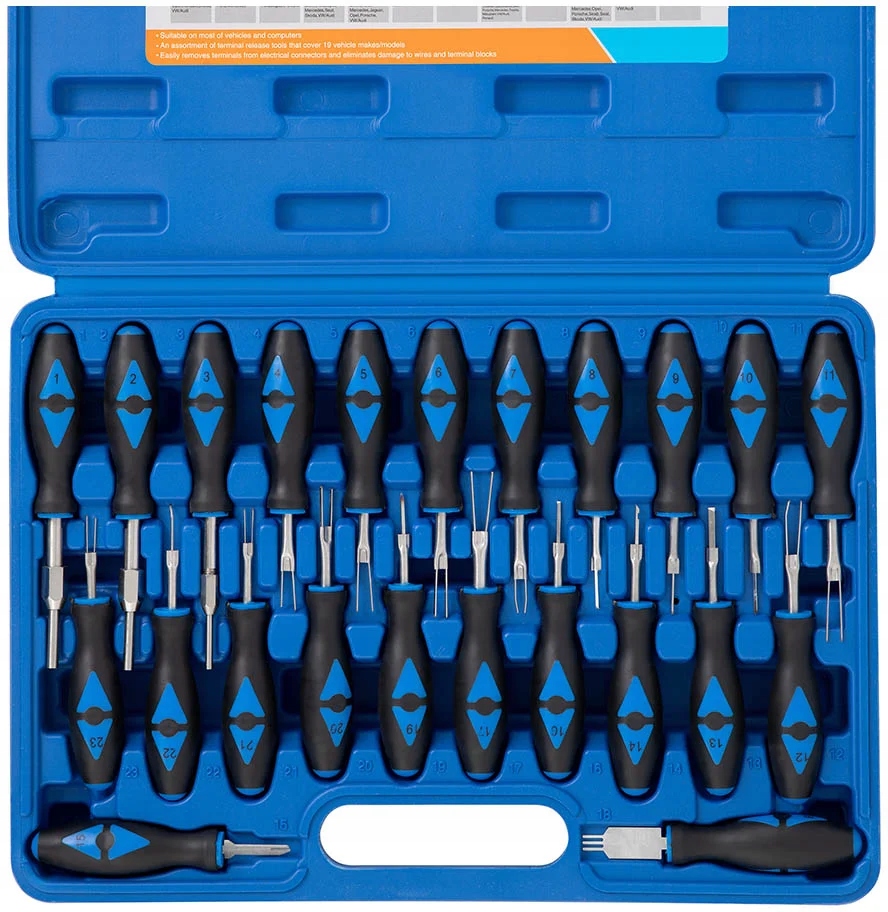 извлекайте разъемы на плоских и круглых штекерах без повреждений с помощью съемников контактов от MSW. Обширный комплект облегчает ремонт большинства автомобилей, поэтому он не должен отсутствовать ни в одной мастерской.п>