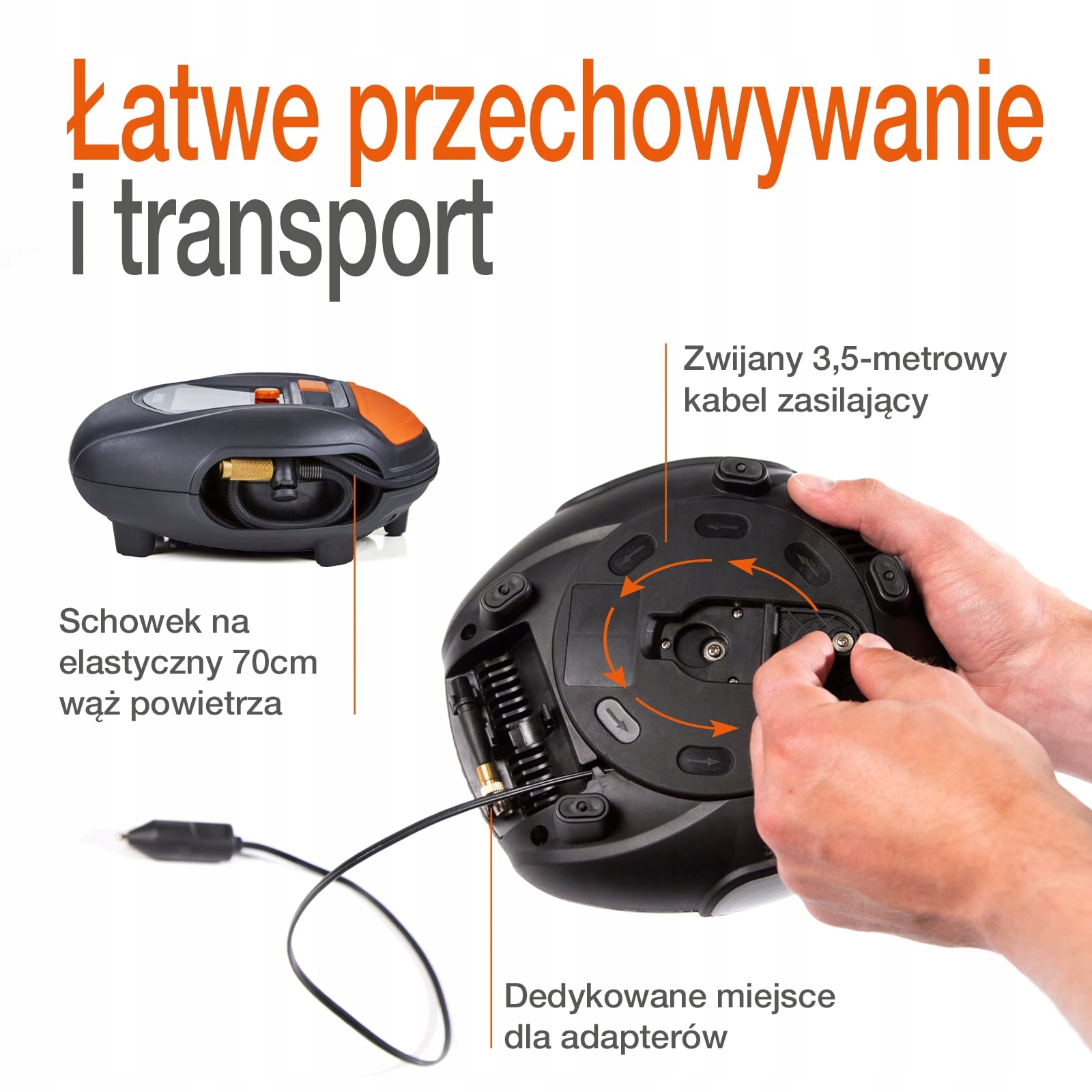 точка отметки Пункты списка: Портативный цифровой воздушный компрессор для автомобильных шин - надежный спутник в дороге, в случае поломки автомобиля или потери давления в шинах, накачивает шину до необходимого уровня давления за 2 минуты. (из расчета накачивания 13-дюймовой шины до 2,41 бар), Механизм намотки/размотки кабеля, Простота использования даже в темноте и при слабом освещении, Быстрый компрессор шин с втягивающимся кабелем