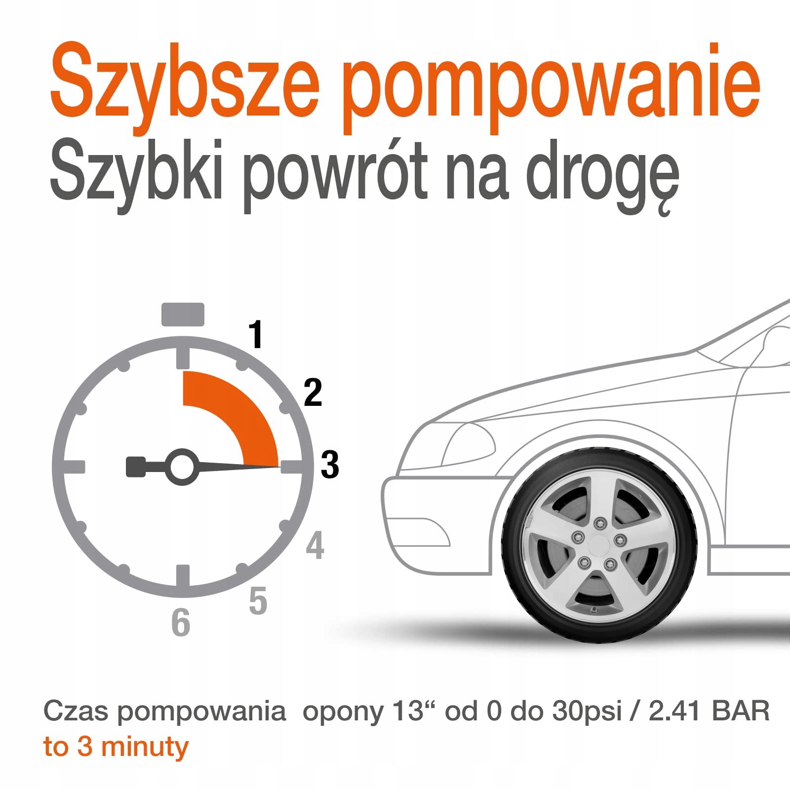 Накачивает шину до необходимого уровня давления за 2 минуты (по при накачке 13-дюймовой шины до 2,41 бар)