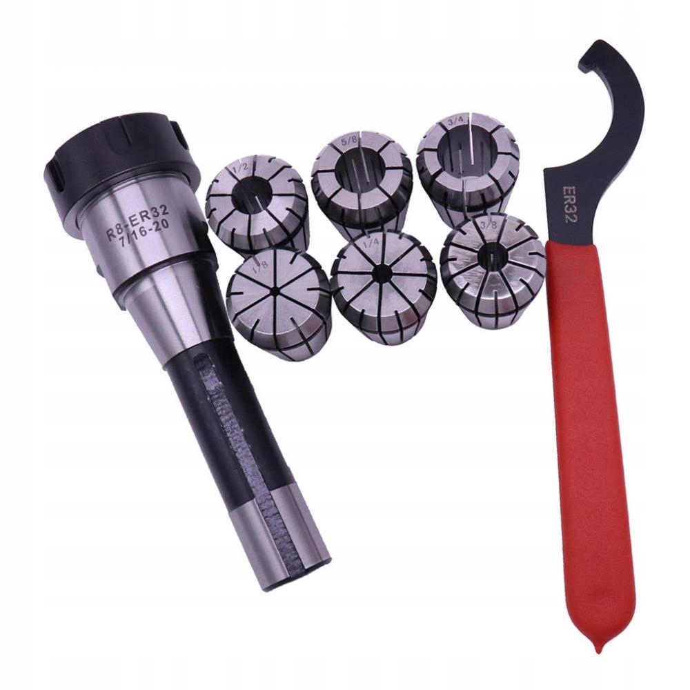 упаковка включает: 1 шт. R8 хвостовик ER32 цанговый патрон. 6 шт. Набор пружинных втулок ER32, 1 шт. Гаечный ключ ER32