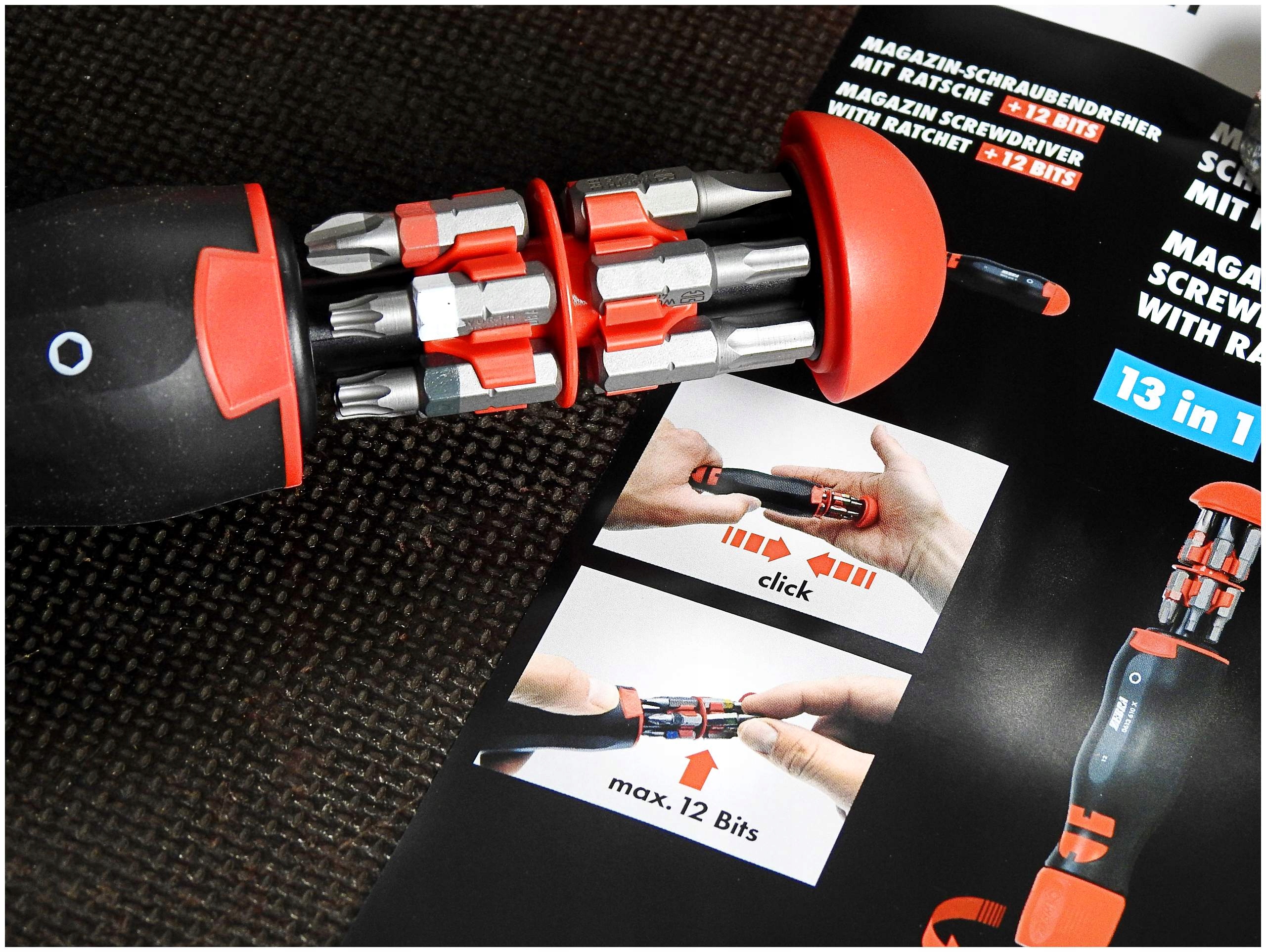Отвертка с трещоткой и магазином на 12 бит