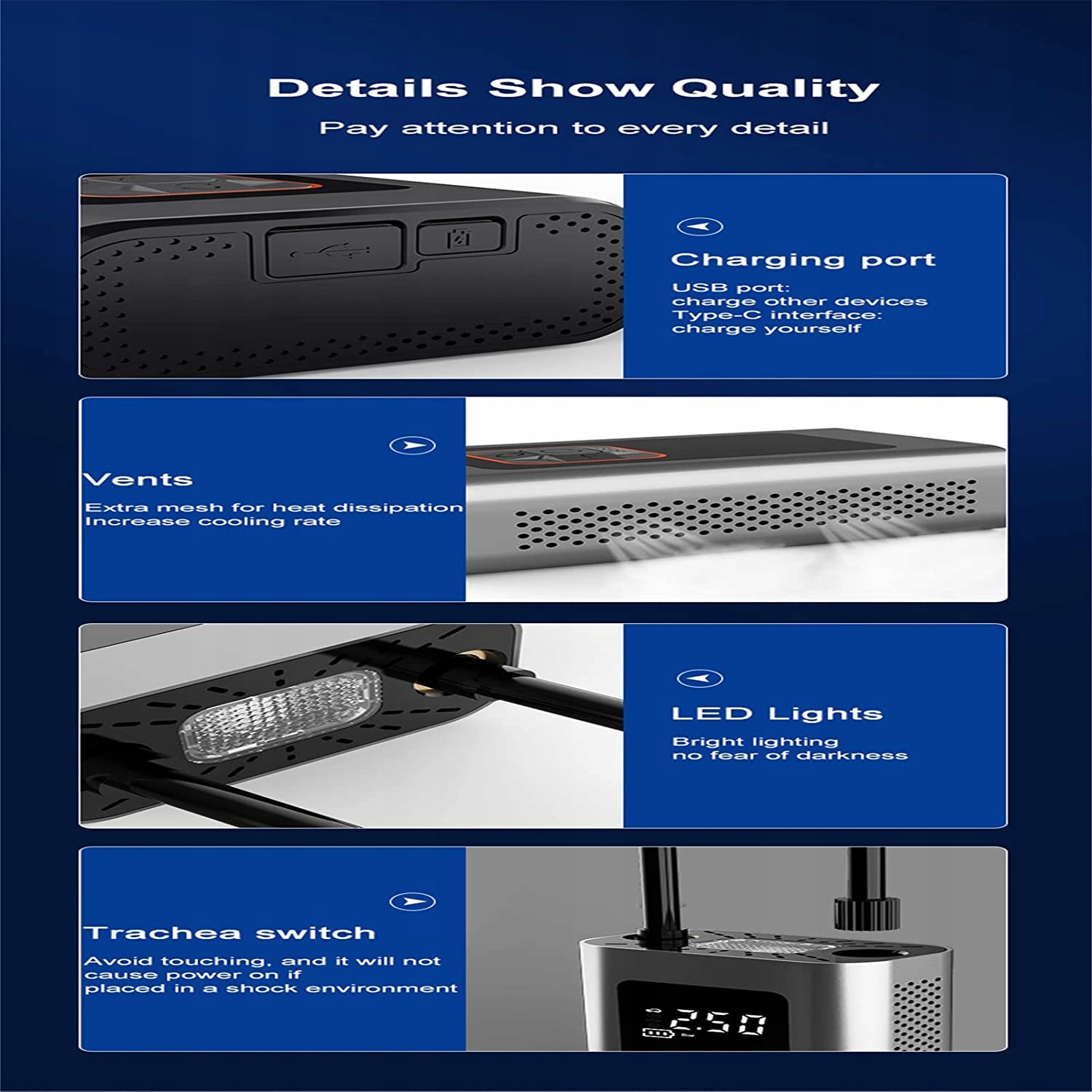 многофункциональный шиномонтажный насос оснащен одним 2 в 1 и 3 адаптерами клапан Presta iga шаровое сопло mona выбирает 5 надувных режимов сцены автомобиля. Цифровая вентиляция и интеллектуальное управление цифровой ЖК-экран будет проветривать актуальную мощность при подаче шиномонтажа. Интеллигентая (ый) воздушный насос имеет 4 дополнительных единиц с функцией автоматического извлечения шиномонтажный насос накачивает до тех пор, пока шиномонтажный насос не будет автоматически прекращаться, когда шиномонтаж оседает. Power Bank LED Light этот переносной электрический насос защитит вас в голых случаях литиевая батарея moe, используемая в качестве powerbank для устройств IOS и Android. Он имеет одинаково конструктивный светодиодный навес, который обеспечивает яркое поле зрения. Дикий этот электрический воздушный насос вам не придется si беспокоиться о разрядке батареи или в темноте во время путешествия. Переносной и удобный переносной воздушный насос с компактной конструкцией, который измеряет только 778 438 124 мм намного меньше и меньше обычного воздушного насоса. Питание от adowable литиевых батарей. Moesz положит его в карман вашего рюкзака или автомобиля, чтобы помочь вам в любое время и в любом месте. Smart Safe переносной шиномонтажный насос предназначен для удовлетворения повседневных потребностей, связанных с накачкой дикий дизайн с теплоизлучающими отверстиями для предотвращения перегрева. Поставляется со всеми аксессуарами кабель Type-C и руководство obsugi. Если у вас есть какие-либо вопросы . Дымы для осигнации лучше, чем для Усуга и Усуга.п>