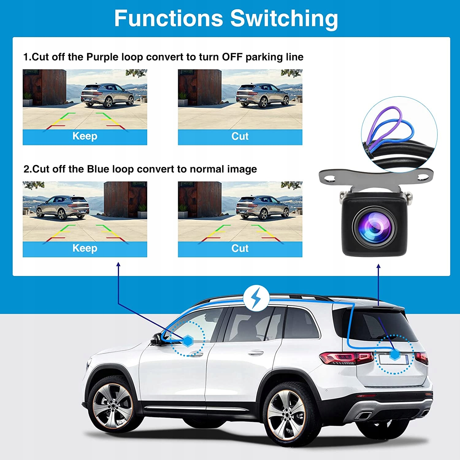 синий провод: управление переключением нормального изображения и зеркального отображения. Это камера двойного назначения, которую можно использовать как переднюю камеру или заднюю камеру. Фиолетовый провод: контролируйте включение / выключение парковочной линии. После того, как вы перерезали провод соответствующего цвета, выключите питание, а затем снова включите всю мощность, чтобы изменить отображаемое изображение.