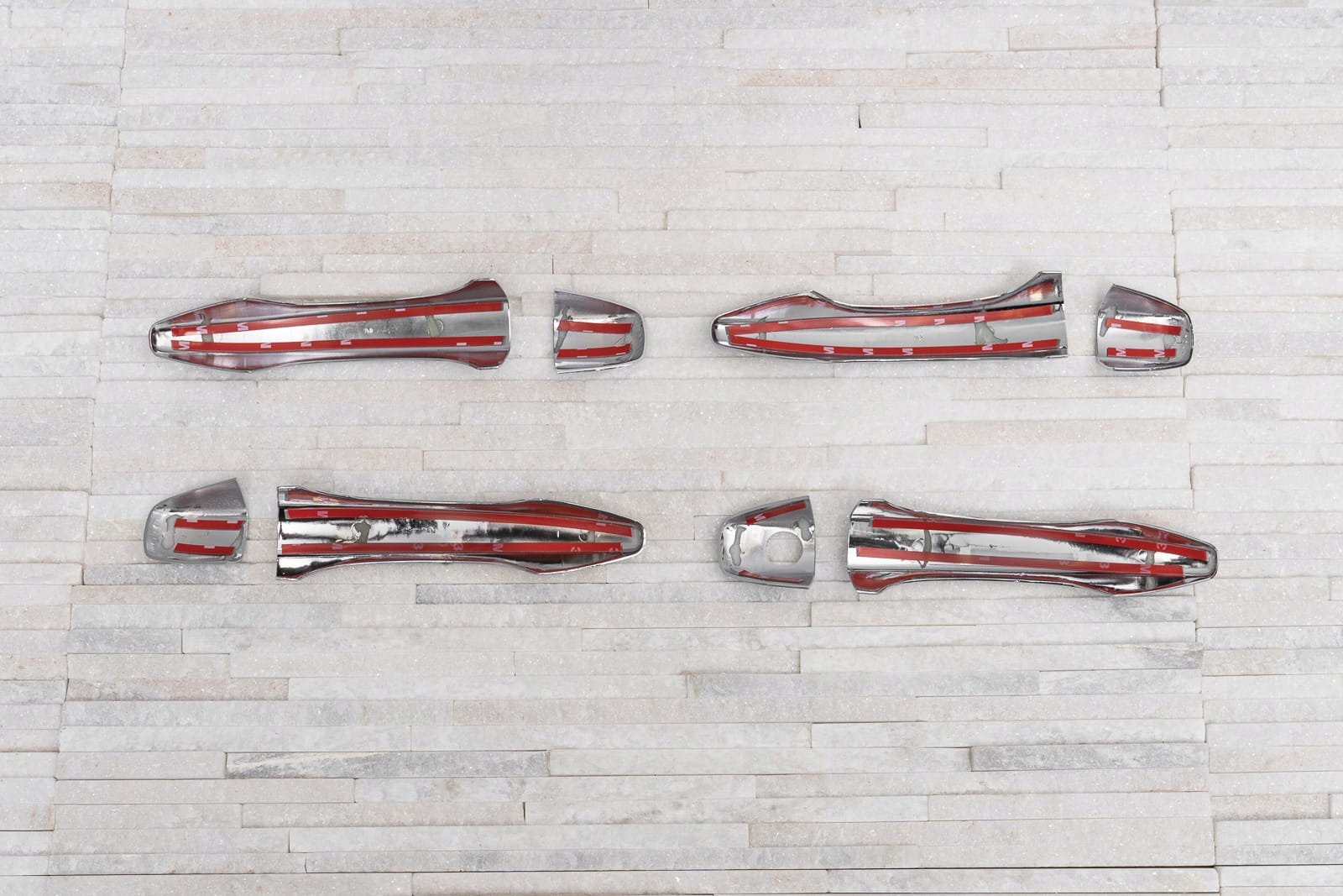 В комплект входит комплект из четырех накладок на дверные ручки. Крепятся они с помощью двустороннего скотча Scotch 3M, нанесенного на внутреннюю часть элементов. Их наносят на обезжиренную поверхность с помощью уайт-спирита или спирта, при температуре выше 18 градусов Цельсия. Мы рекомендуем профессиональную установку.