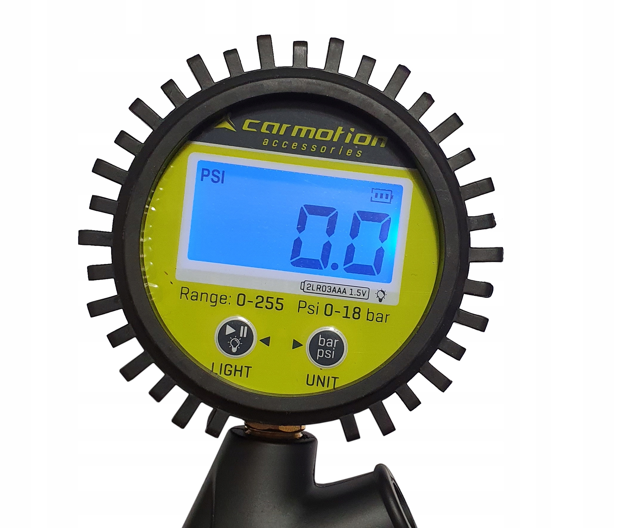 Пистолет для накачивания шин оснащен прорезиненным цифровым манометром с подсветкой, градуированным до максимального давления 18 БАР, и резиновым шлангом длиной 40 см с зажим для накачивания шин.