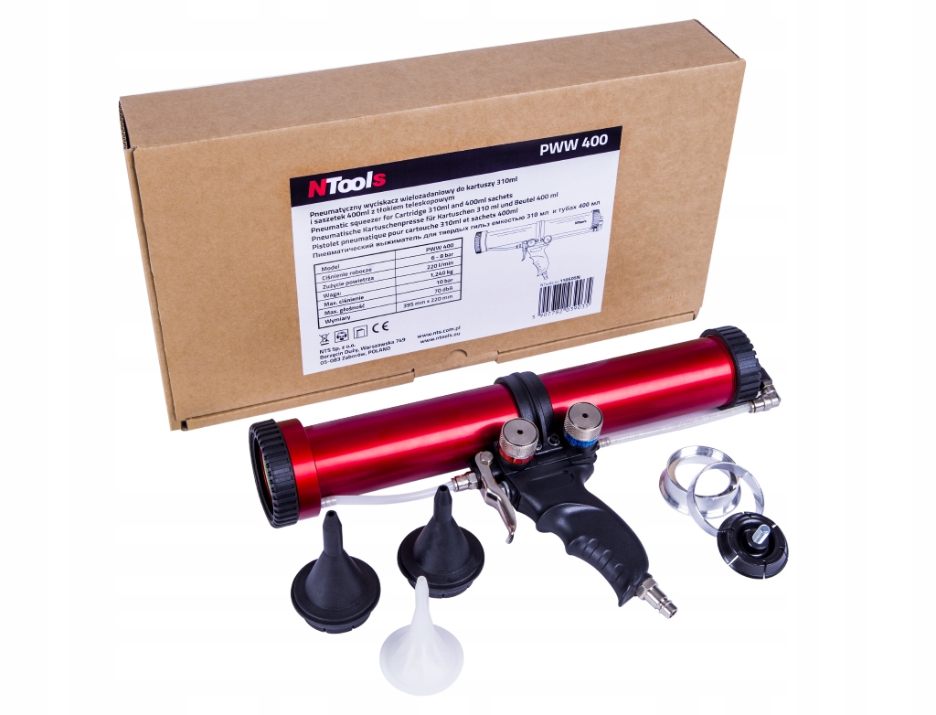 NTools PWW 400 - пневматический многозадачный соковыжималка для картриджей 310 мл и Саше 400 мл с телескопическим поршнем. Позволяет воссоздать заводскую фактуру (типа” гильзы") распылительного уплотнения сварочных швов или сварных швов. Соковыжималкой можно также получить текстуру типа "ягненок" и очень точно уложить уплотнительные ролики из любого типа массы, упакованной в картуш с максимальной емкостью 310 мл или пакетик с емкостью не более 400 мл.