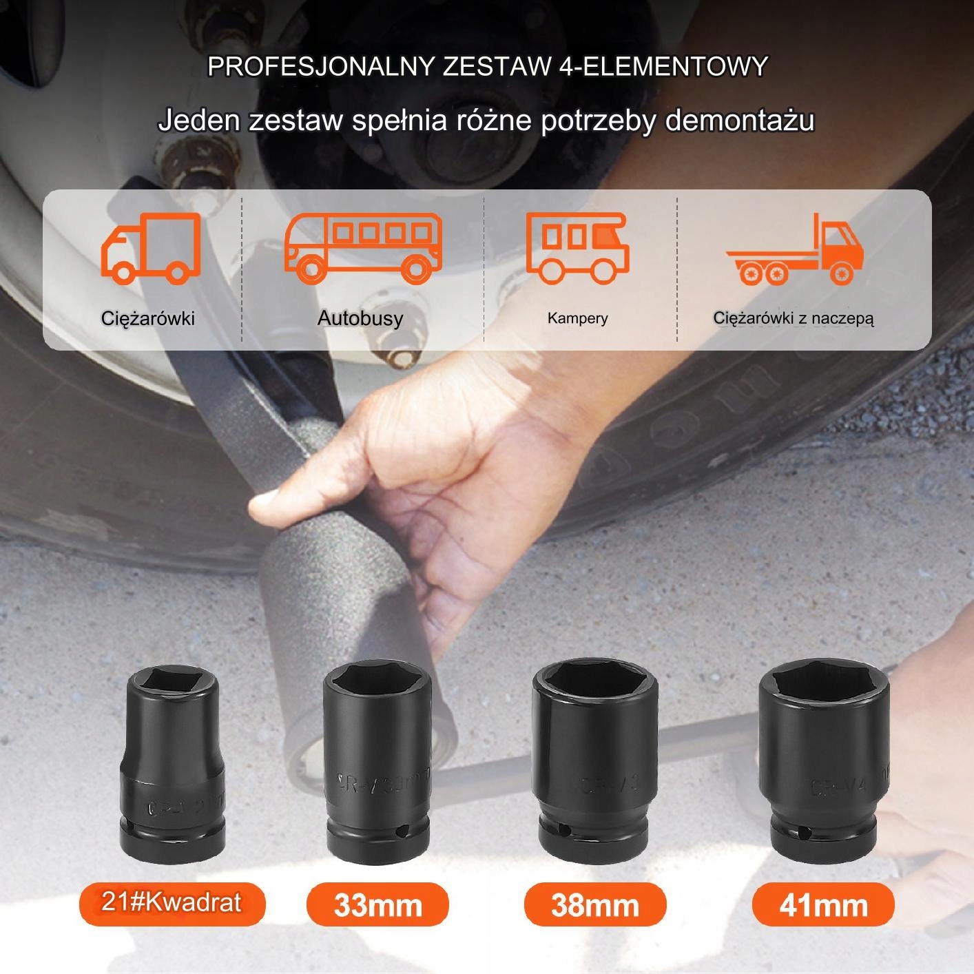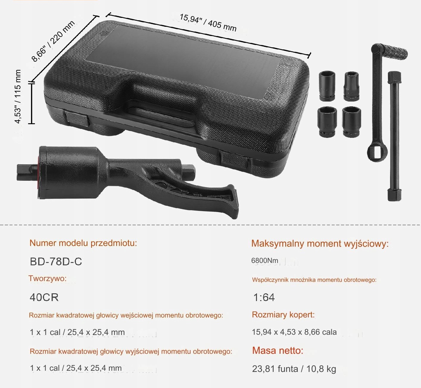 В комплект входит динамометрический ключ диаметром 1 дюйм и четыре головки разных размеров, что делает его чрезвычайно универсальным. Адаптированный для работы с различными типами колесных гаек, он идеально подходит для коммерческих и сельскохозяйственных транспортных средств, таких как грузовики, автобусы, кемперы, седла тракторов. и другие