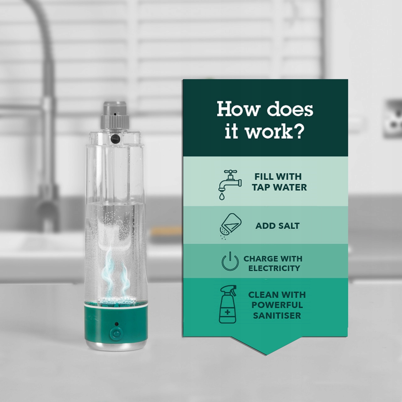 Съемная бутылочка емкостью 400 мл позволяет приготовить собственное дезинфицирующее средство на основе воды, соли и электричества .