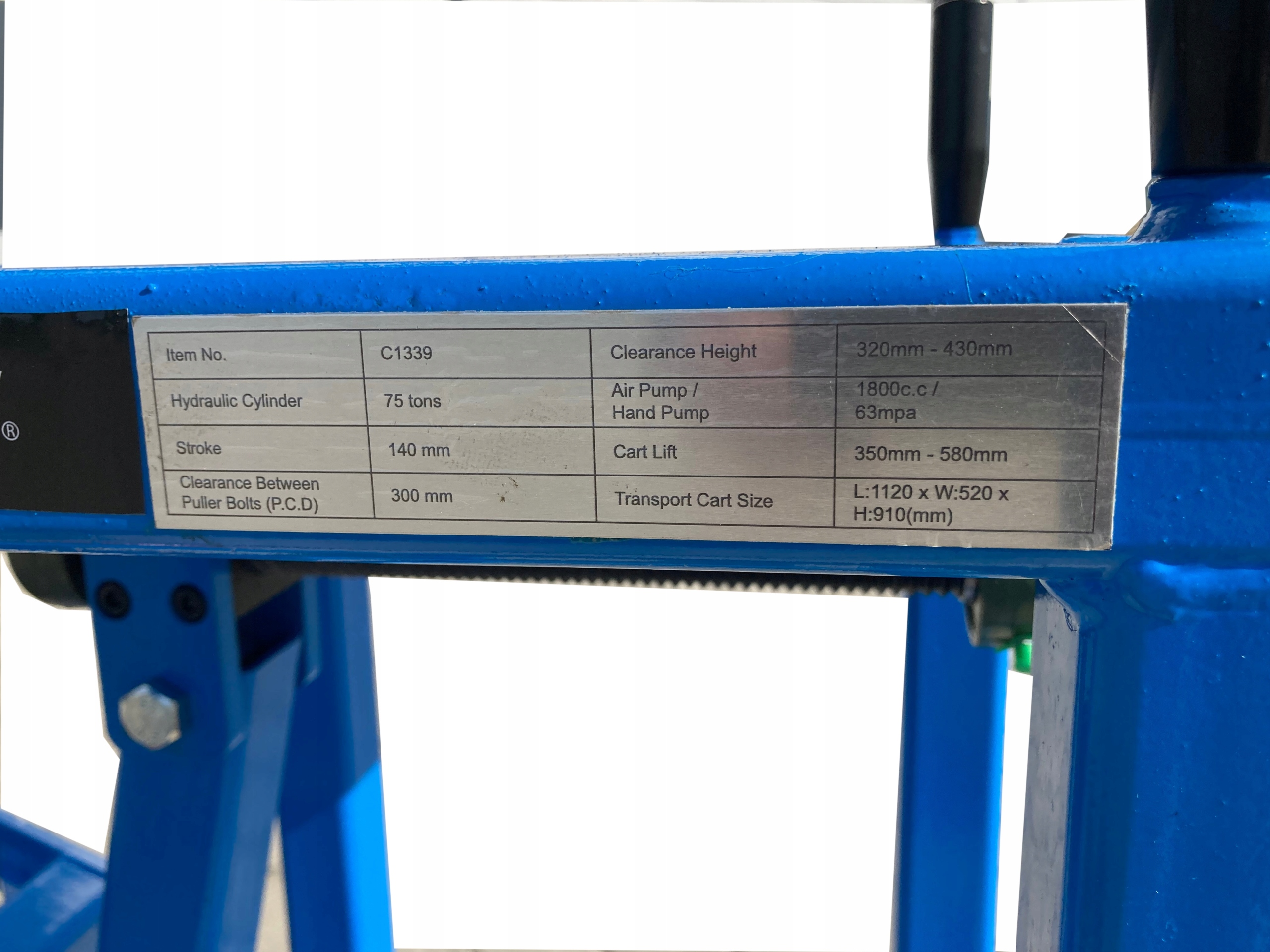 • гидропневматический насос с педальным управлением. Диапазон давления воздуха: 2,8-10,3 бар (40-150 PSI)Максимальное рабочее давление: 700 бар (10000 PSI)Объем масляного бака: 3,2 L