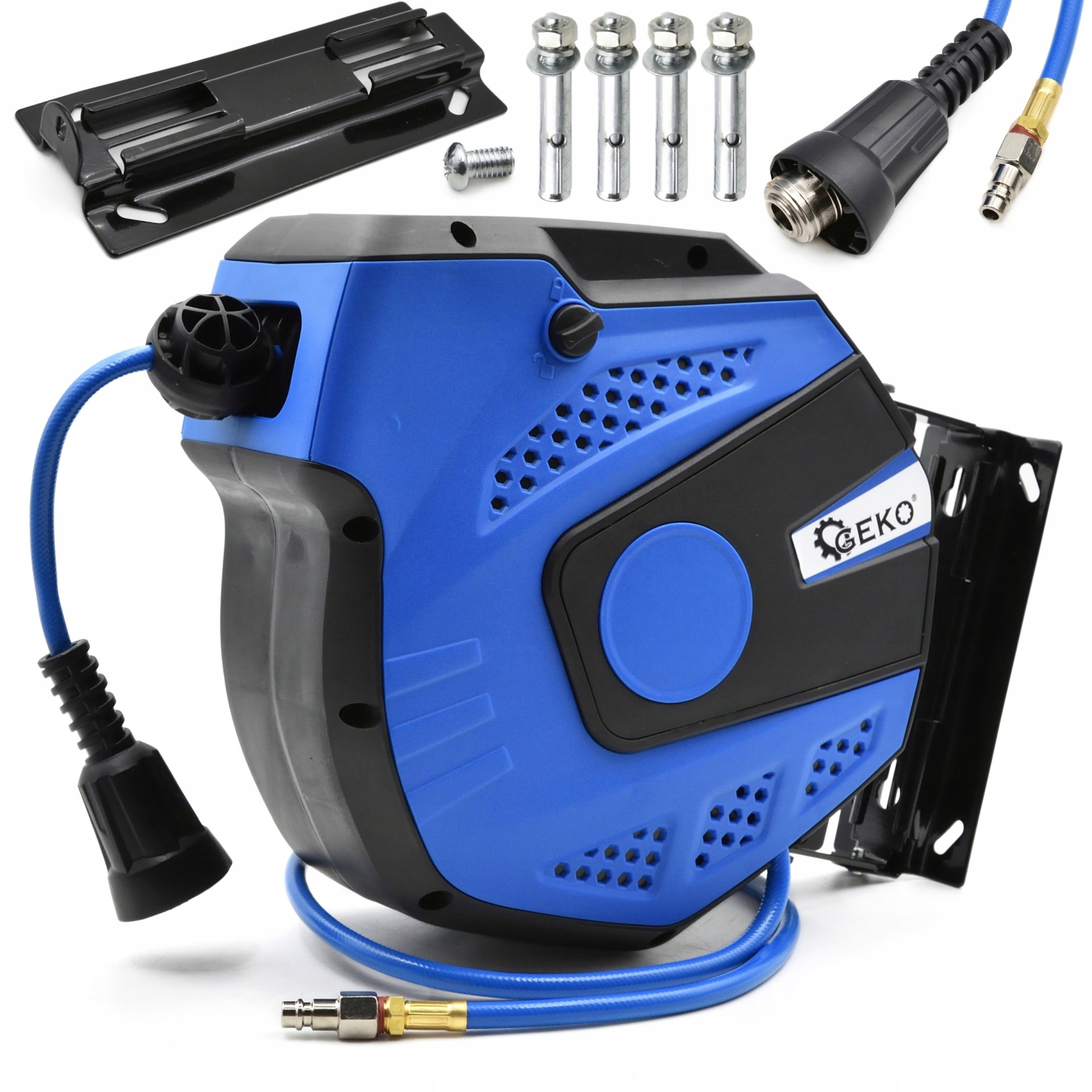 Пневматический шланг на катушке из высококачественного армированного ПВХ. Характеризуется высокой устойчивостью к высокому давлению. Катушка оснащена замком, предотвращающим самопроизвольное скатывание шланга, и подвеской, позволяющей повесить шланг на стену. Характеристики изделия: высокое качество изготовления, высокая устойчивость к высокому давлению, шланг из армированного ПВХ, катушка оснащена фиксатором для предотвращения самопроизвольного сматывания шланга, поворотный настенный кронштейн, крепежные штифты в комплекте, Технические характеристики: Длина шланга: 1-4 м Внутренний диаметр шланга: 6,5 мм Внешний диаметр шланга: 1,0 мм Подключение воздуха: 1/4" Рабочее давление: 8 бар Материал шланга: армированный ПВХ Рабочая температура: от -5 до +45°C