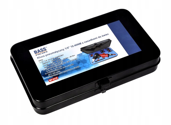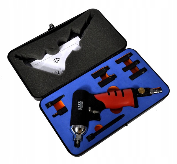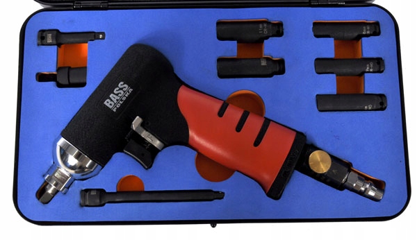в комплекте с ударным пневматическим гаечным ключом имеются ударные насадки 1/4" в размерах 8-12 мм, два удлинителя и универсальный адаптер.