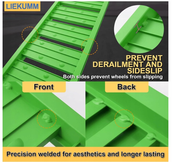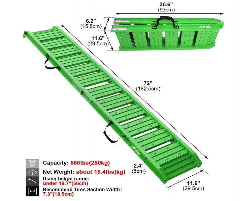 Складная погрузочная рампа изготовлена из высококачественного алюминиевого сплава, что обеспечивает безопасную и стабильную погрузку. Пандусы весят около 7 кг за штуку, легки и удобны в переноске, поэтому у вас практически нет ограничений. Складные погрузочные рампы имеют крючки сверху.