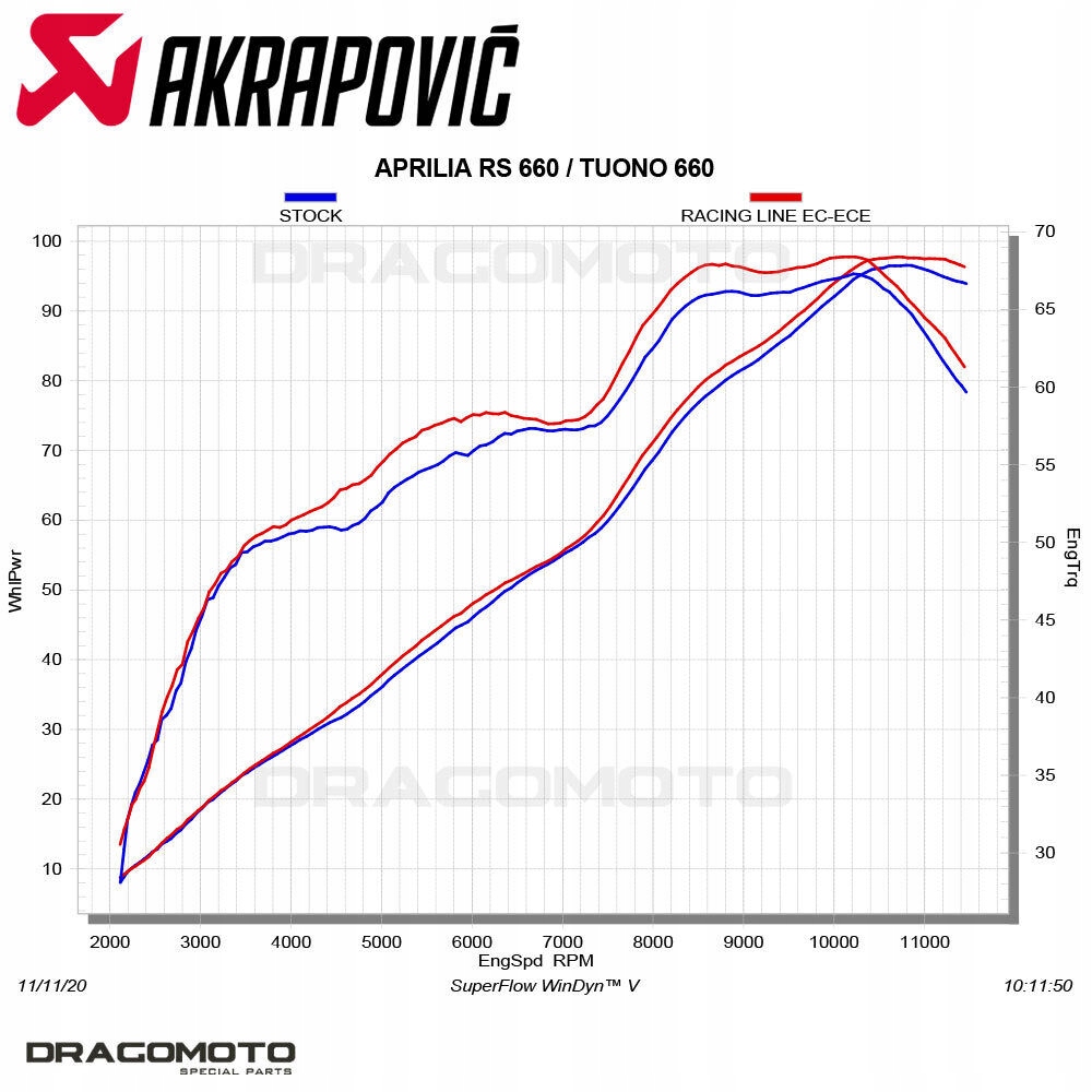- testing on the Akrapovic in-house Dyno, in back-to-back runs of Bikes equipped with a Racing line (Carbon) exhaust and Standard Stock exhaust System, Recorded an increase of 2.4 HP at 11,200 RPM and a gain of 3.6 nm of Torque at 4,550 rpm, which gives the Rider A pronounced Throttle response
