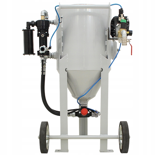 предлагаемая многофункциональная струйная машина-это профессиональное, безопасное и современное устройство польского производителя. Очиститель оснащен напорным баком с коническим дном для облегчения соскальзывания материала и ревизионным сливом, позволяющим быстро опорожнить резервуар от абразива. Высококачественный немецкий абразивный клапан Macro+ отличается повышенной механической прочностью и стойкостью к истиранию по сравнению со стандартными клапанами, установленными на очистителях конкурирующих компаний. Управление очистителем легко и безопасно благодаря расположению рукоятки управления на конце рабочего провода. Несомненным преимуществом этого решения является возможность прерывания работы устройства оператором, непосредственно выполняющим процесс пескоструйной обработки, что продиктовано последними правилами техники безопасности. Конструкция клапана устраняет необходимость в дорогих диафрагмах и поршнях.