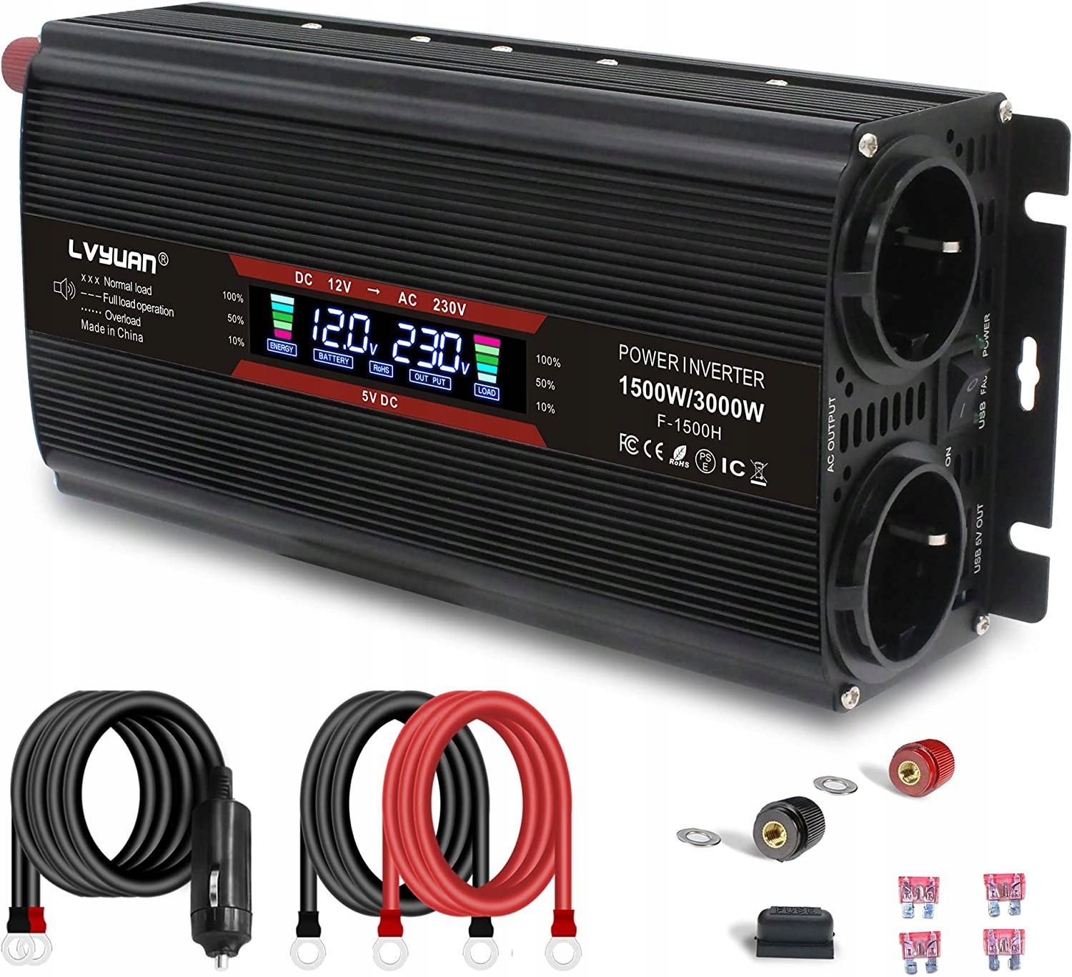Комплект поставки: Преобразователь напряжения 12 В на 230 В, с модифицированной синусоидой, 1500 Вт, кабель подключения аккумулятора длиной около 50 см, запасной ручной предохранитель.