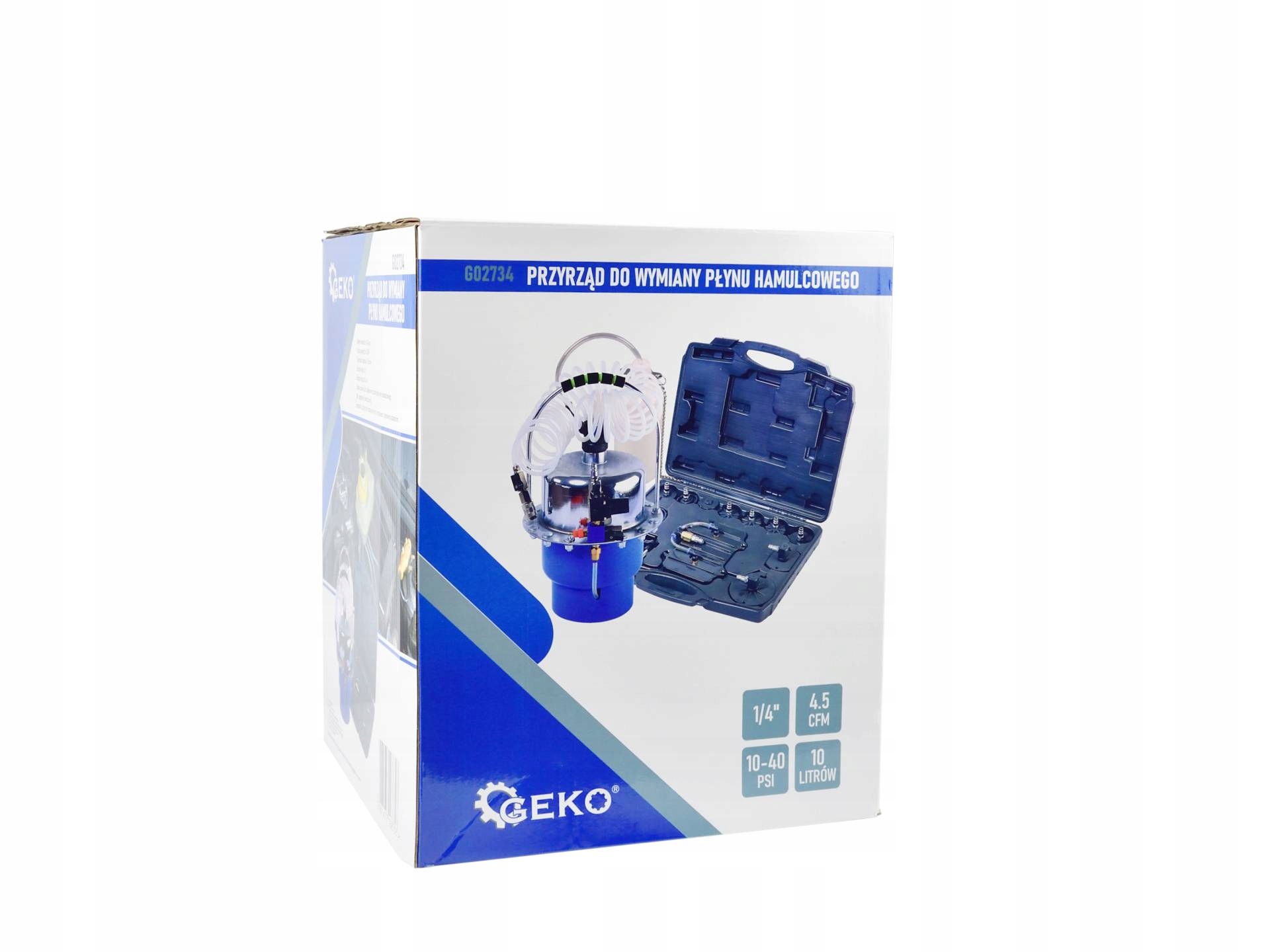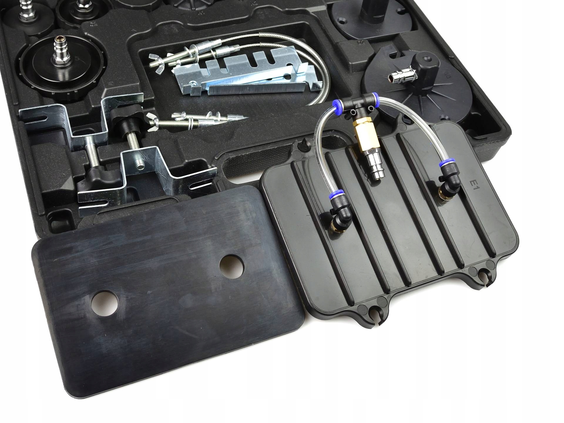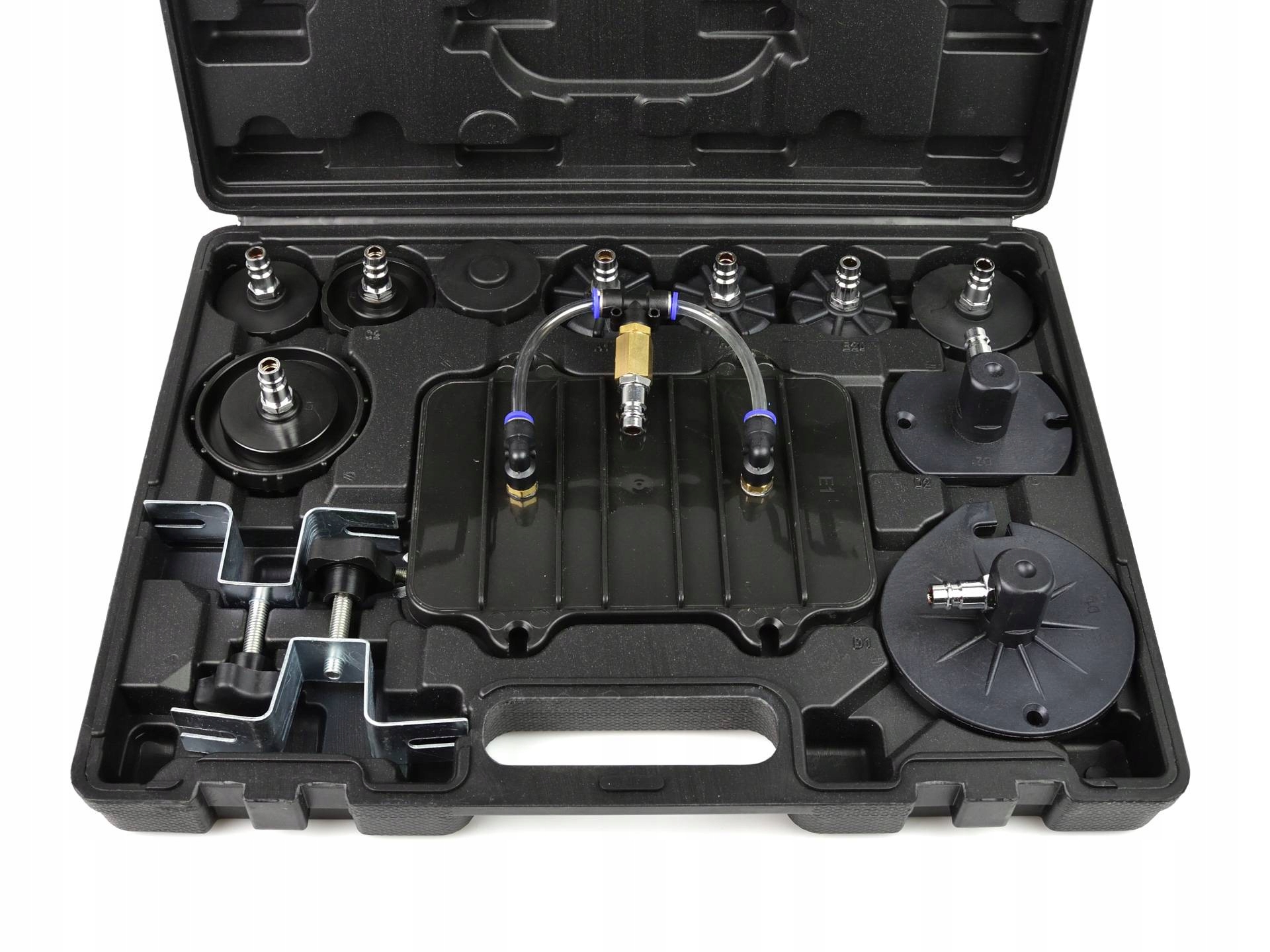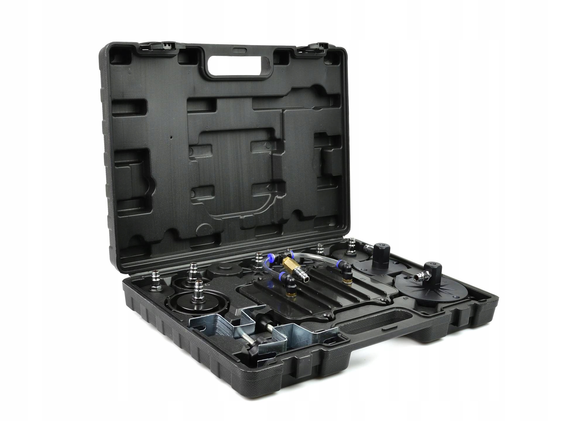 Комплект для обслуживания тормозной системы. Устройство позволяет одному человеку легко и быстро заменить жидкость в тормозной системе и гидромуфте. Комплект также позволяет быстро прокачать тормозную систему. В комплект поставки устройства входит удобный чемоданчик с набором переходников, позволяющих работать с большинством тормозных систем. Характеристики продукта: позволяет производить замену жидкостей в тормозной системе и гидромуфте одним человеком; позволяет легко и быстро прокачать тормозную систему; в комплекте имеется чемодан с набором переходников, подходящий для большинства марок автомобилей; устройство, оснащенное насосом низкого давления. резервуар, который можно предварительно заполнить сжатым воздухом, благодаря чему устройство не требует постоянного подключения к компрессору, понятный манометр, показывающий текущее давление в резервуаре, пневматический шланг длиной около 5,4 м, технические характеристики: Эксплуатация давление: 10-40 PSI (0,7-2,8 бар) Расход воздуха: 127,43 л/мин (4,5 CFM) Емкость напорного бака: 10 литров Соединение для воздуха: 1/4” Длина шланга: 5,4 м Комплектация: переходники для бачка тормозной жидкости – 8 шт. универсальные переходники – 3 шт., емкость для отработанной тормозной жидкости с кабелем и резиновым переходником