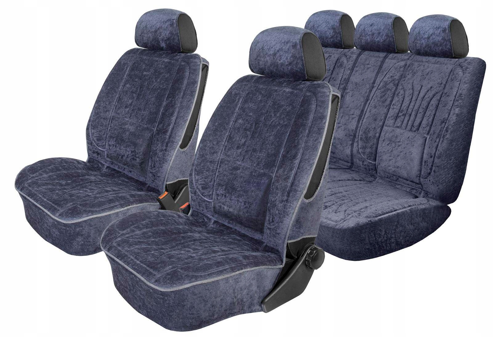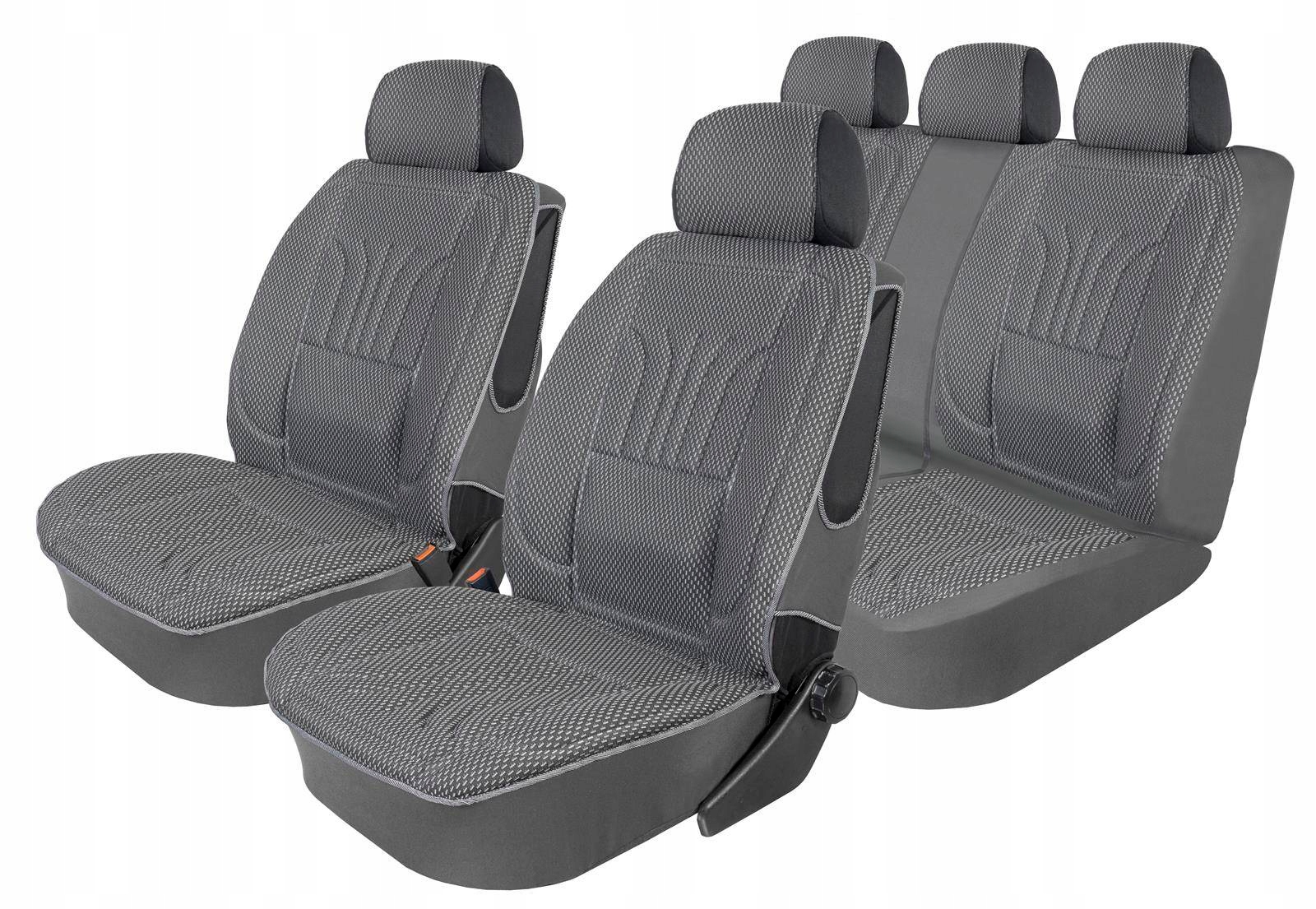 Передние сиденья 2 эргономичных чехла Размер «XL»: 110 см х 60 см; спинка и сиденье с рельефным эргономичным рисунком чехла, разделенным на 1/3 и 2/3 с двумя молниями в каждом элементе; 5 подголовников.