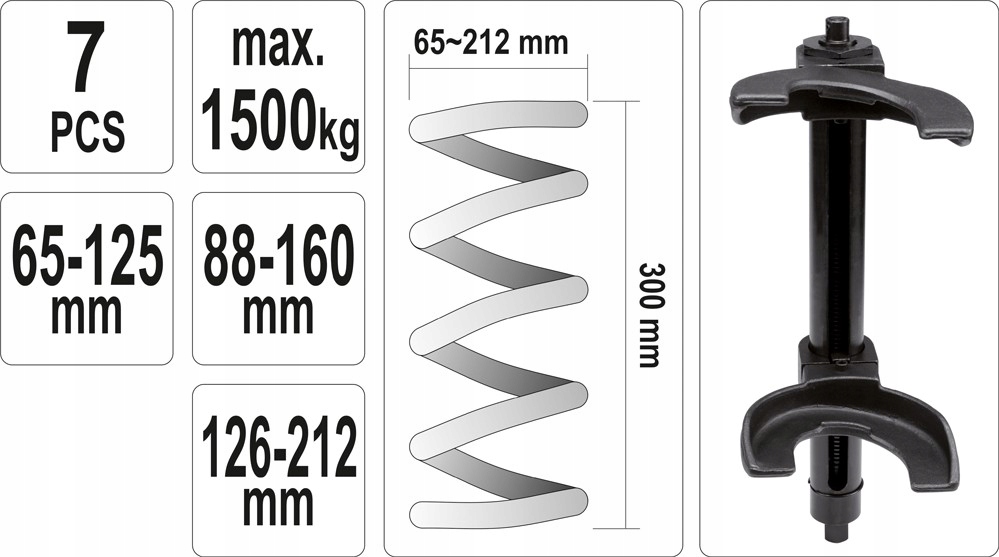 трехточечные регулируемые рукоятки для регулировки кривизны пружины с регулировкой в диапазоне: 65 мм - 125 мм, 88 мм - 160 мм, 126 мм - 212 мм. Общая длина съемника 400 мм позволяет поддерживать пружины высотой до 300 мм. Максимальное тяговое усилие съемника: 1500 кг.