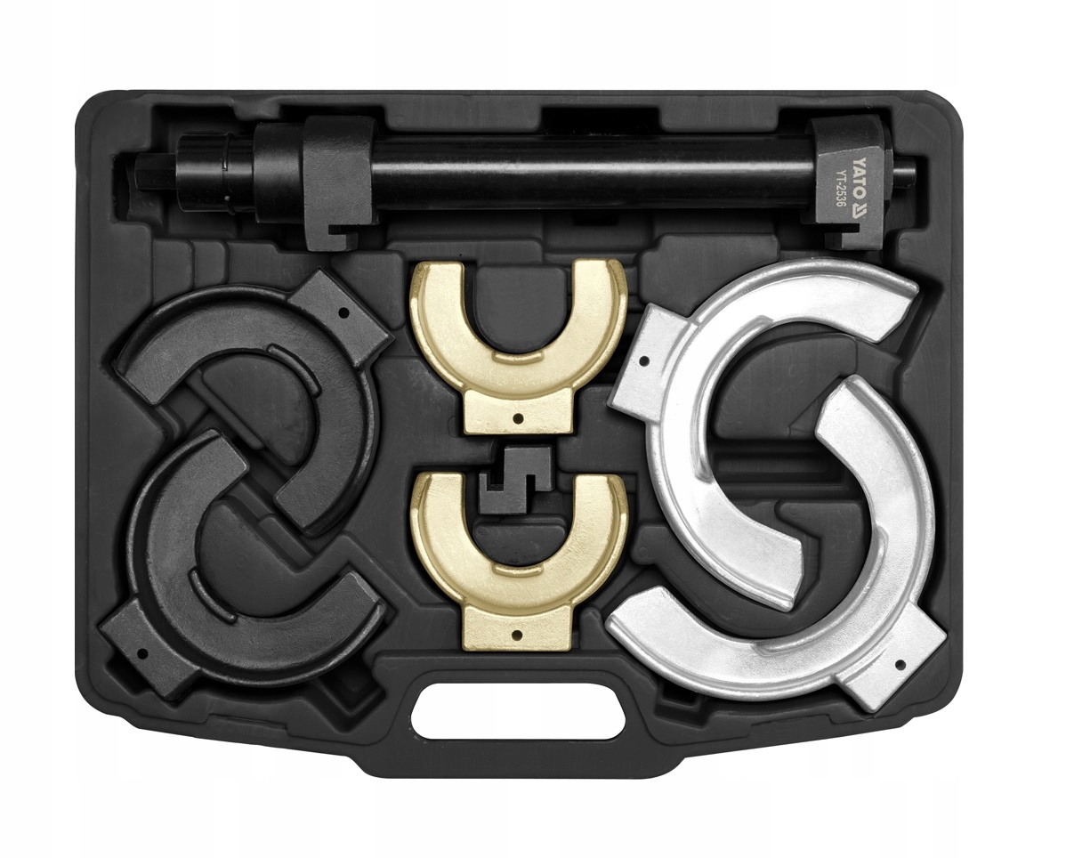 комплект предназначен для замены амортизаторов в подвеске типа McPherson. Съемник имеет сменные ручки для поддержки пружин диаметром от 65 мм до 212 мм. Изготовлен из легированной стали CrMo SCM415, поверхность фосфорирована.