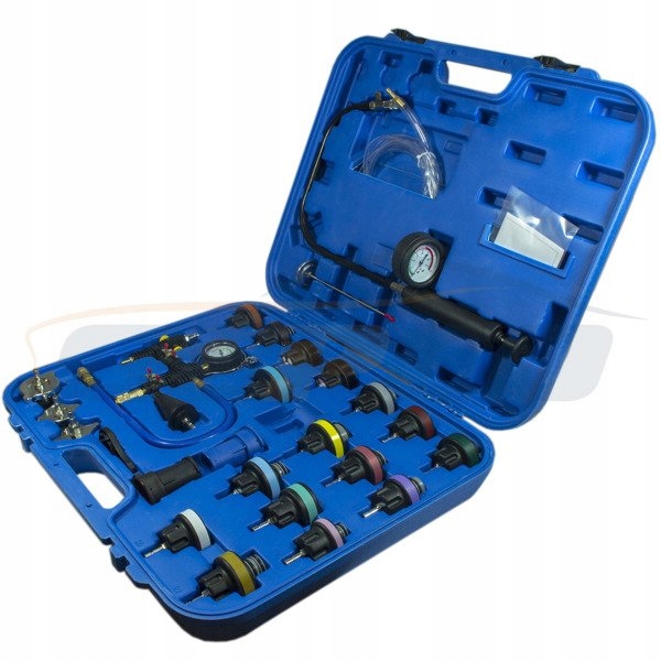 Благодаря профессиональному набору инструментов вы можете обнаружить внутренние утечки двигателя, вызванные испорченные прокладки головки цилиндров или трещины колодки головки. Инструменты позволяют изменять охлаждающую жидкость и проверять герметичность системы охлаждения автомобиля, включая сердечник радиатора, нагреватель и крышку радиатора, очень просто. Он очищает вакуум и помогает заполнить систему охлаждения автомобиля и удалить пузырьки воздуха. Термометр в комплекте отображает температуру охлаждающей жидкости 200 °C.