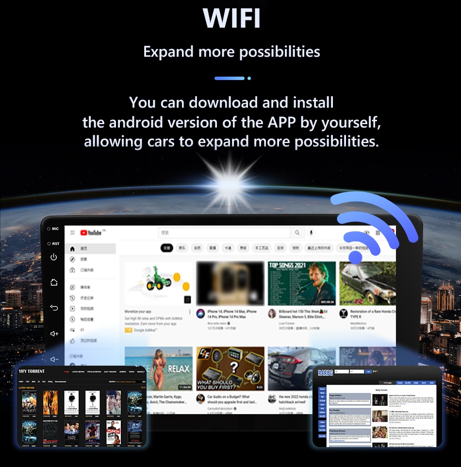 слушайте музыку с телефона, радио, YouTube, Spotify, загружайте музыкальные файлы на радио. Воспроизведение HD-видео 1080p.