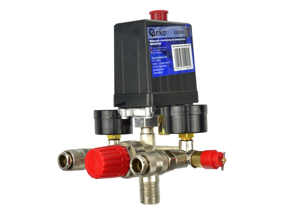реле давления с коллектором, двумя быстроразъемными фитингами и двумя манометрами. Предназначен для компрессоров на 230В.