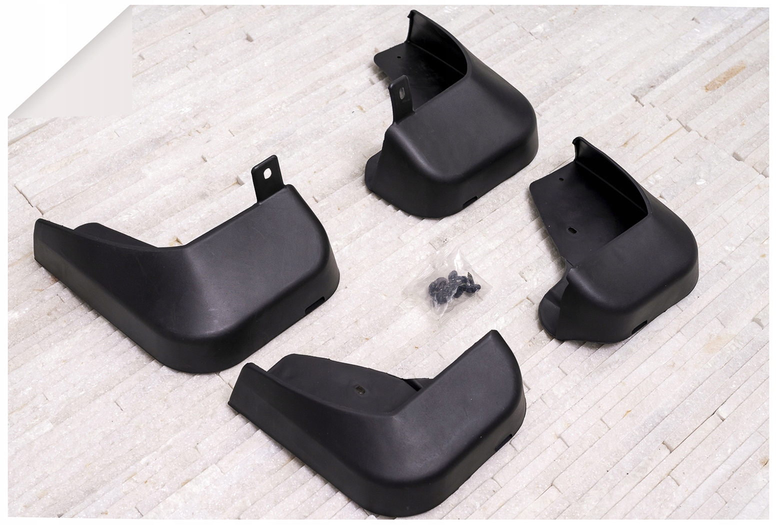 В комплекте четыре брызговика и монтажные детали. Продукт абсолютно новый, оригинально упакован. Брызговики изготовлены из высококачественного пластикового материала, что обеспечивает достаточную долговечность изделия.