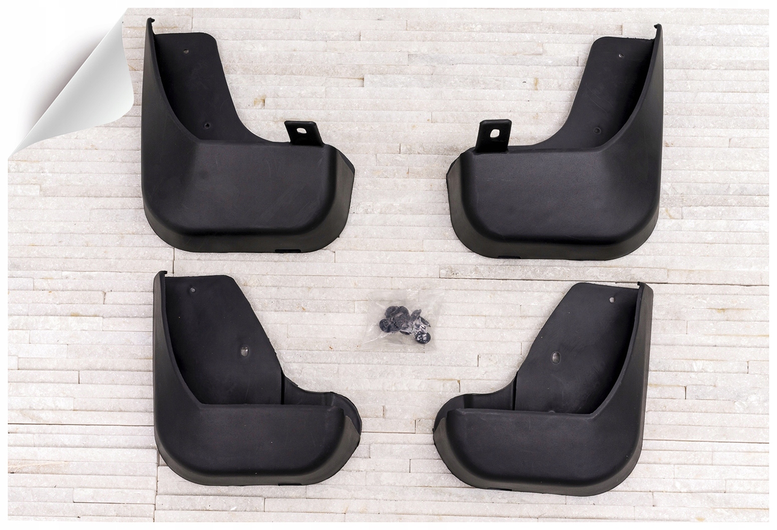 В комплект входит комплект из четырех брызговиков и деталей для сборки. Абсолютно новый товар, в оригинальной упаковке. Брызговики изготовлены из высококачественного пластика, что обеспечивает долговечность изделия.