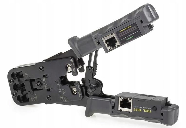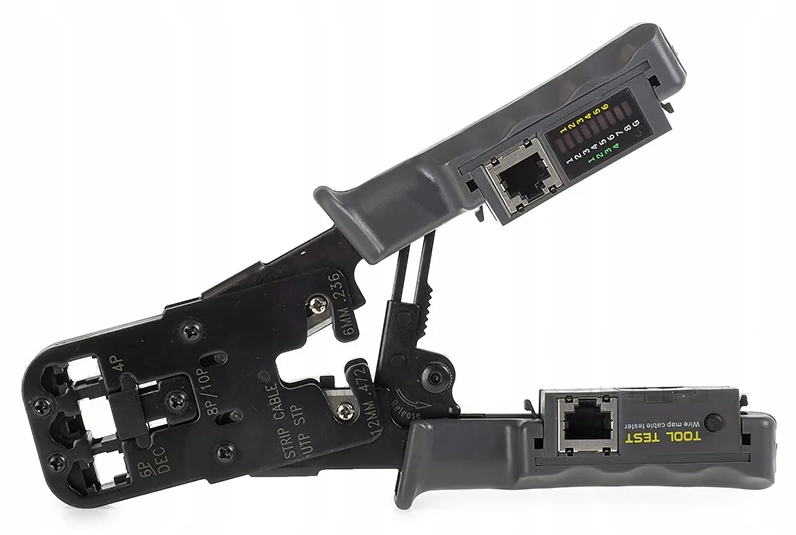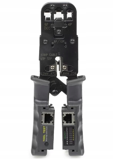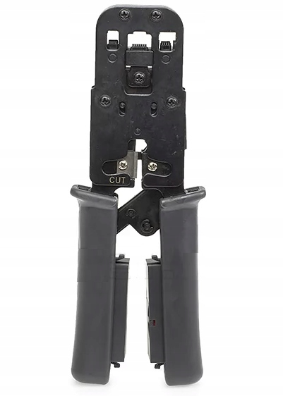 инструмент позволяет зажимать компьютерные разъемы RJ45 и телефонные (RJ11, RJ12), зачищать и обрезать лишний провод. Кромкооблицовочный зажим обеспечивает равномерное надавливание на все контакты.п>