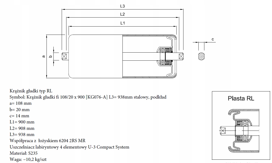 крейсер изготовлен из трубы fi 108 и оси fi 20mm, установленной на подшипнике 6204, и защищен лабиринтными уплотнениями типа U-3 Compact System от пыли и других загрязнений (это двойной лабиринт с скользящей смазкой) крейсер окрашен стандартной грунтовочной краской. Он имеет два оправки, выходящие за пределы контура мантии с зачесанными наконечниками шириной 14 мм на глубине 15 мм.