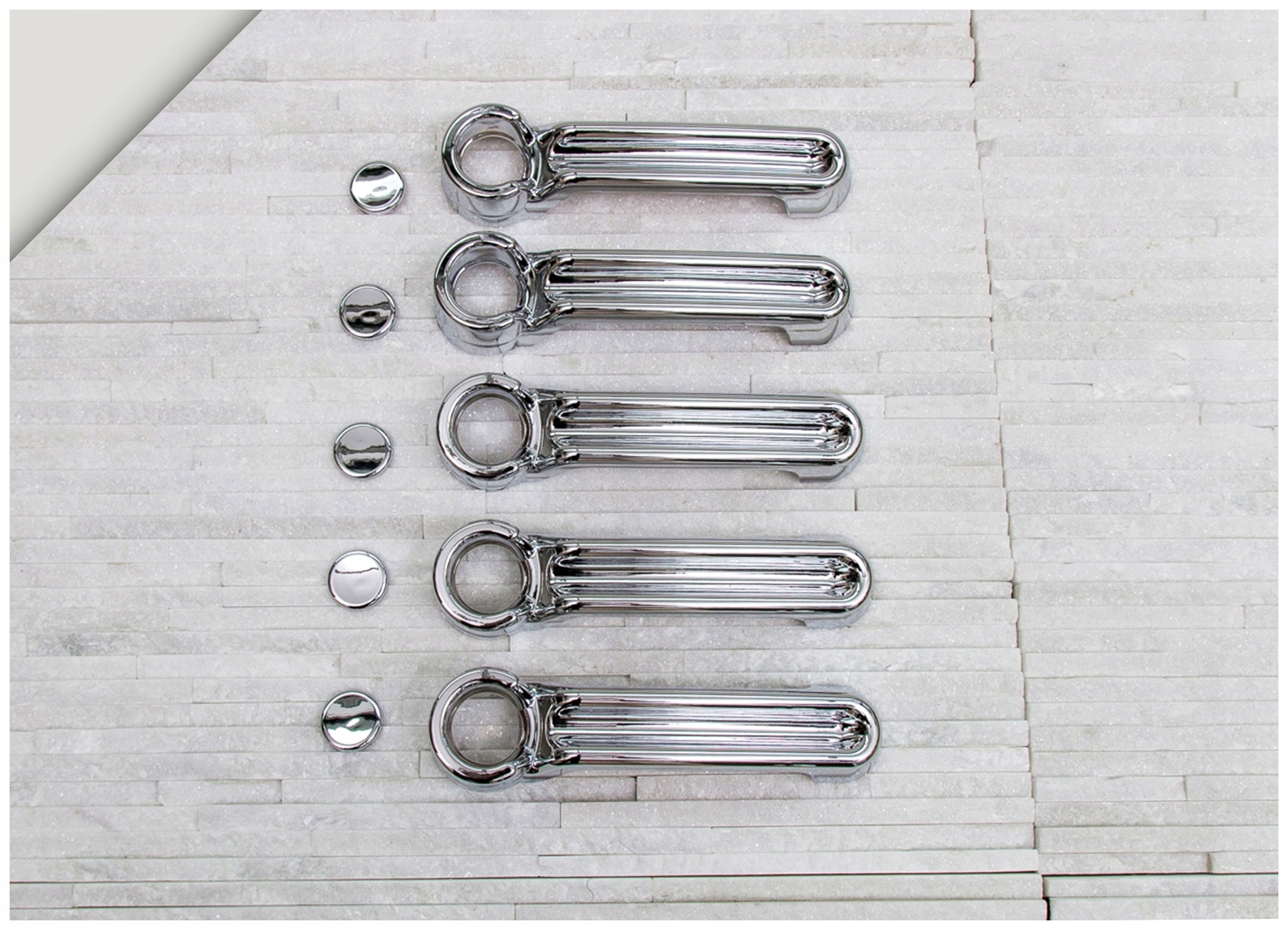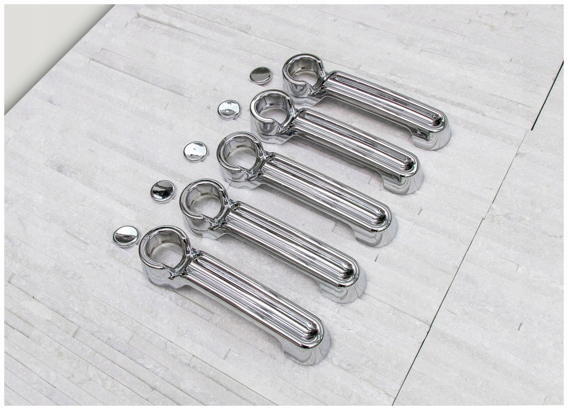 эти элементы изготовлены из высококачественного хромированного АБС-пластика. Простая и безопасная установка, ее можно сделать самостоятельно. Накладки монтируются с помощью двусторонней клейкой ленты Scotch 3M, нанесенной на внутреннюю сторону. Их следует наносить на обезжиренную поверхность с помощью экстрактивного бензина или спирта при положительных температурах от 18 ° C. В комплект входят пять накладок на дверные ручки.
