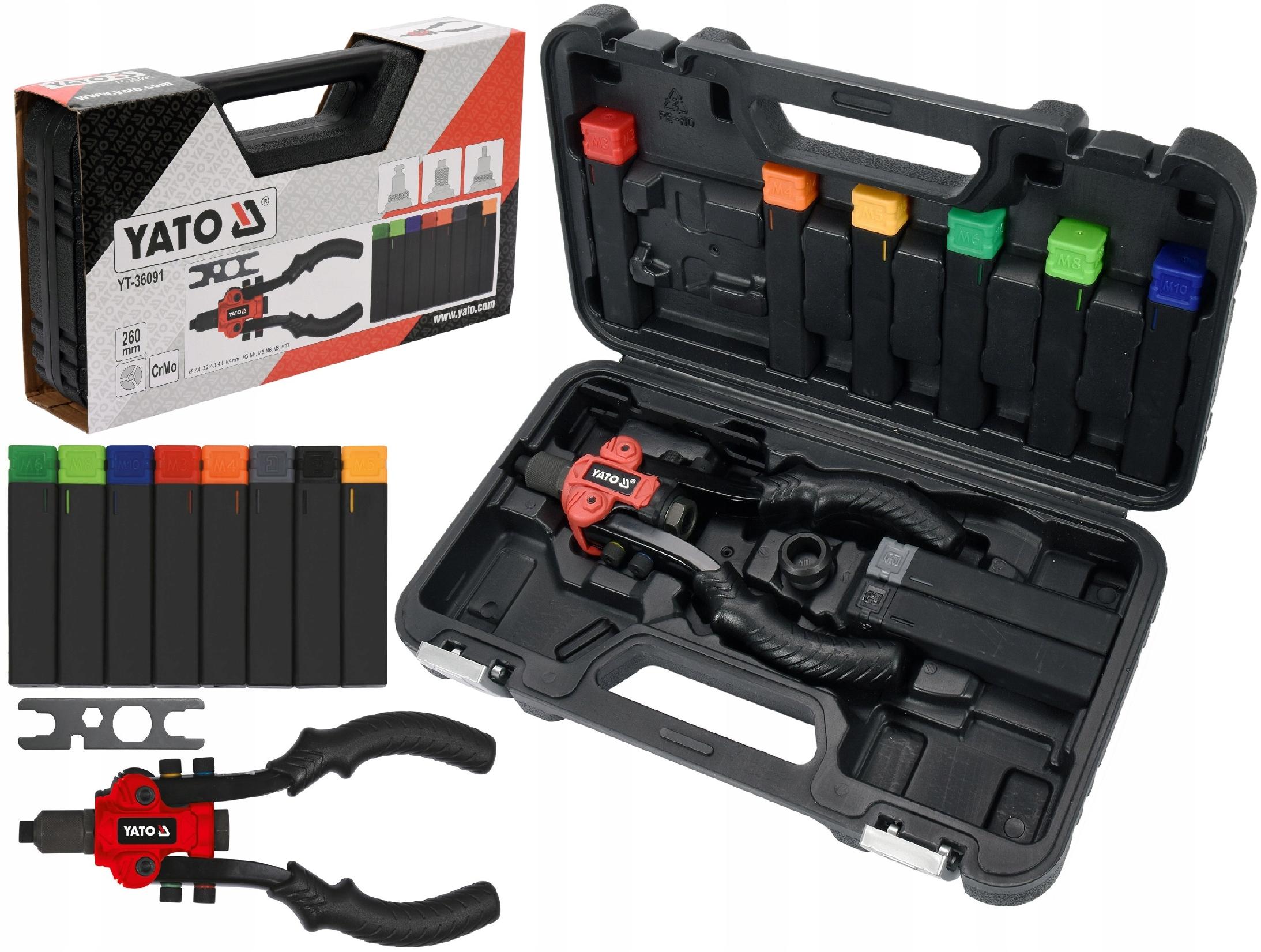 Заклепочник YT-36091 3-функциональный от YATO предназначен для соединения материалов с помощью заклепок-гаек, заклепок и резки двумя резцами (квадратными и круглыми). Заклепочник с головкой заклепочной гайки соединяет материалы с помощью втулки с внутренней резьбой. Это позволяет крепить дополнительные элементы саморезами или шурупами по металлу. Головки размеров: М3,М4,М5,М6,М8,М10, .