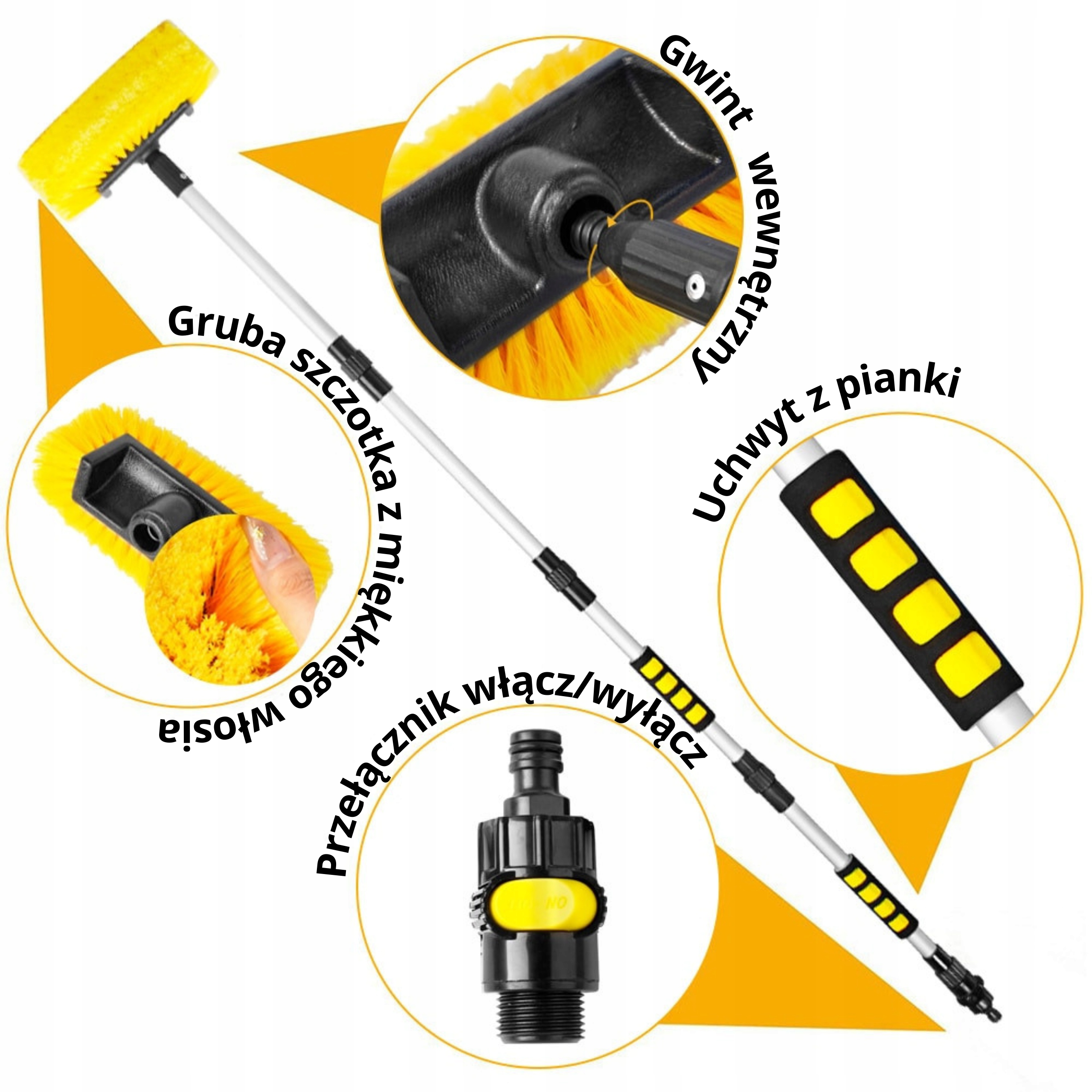 алюминиевая профилированная палка с одной сторонымягкой четырехплоскостной щеткой для мытья, с другой – ручкой спенопластовыми мягкими ручками, быстроразъемной муфтой для соединения шланга с водой иклапаном подачи воды . К палке можно очень быстро подключить воду.п>