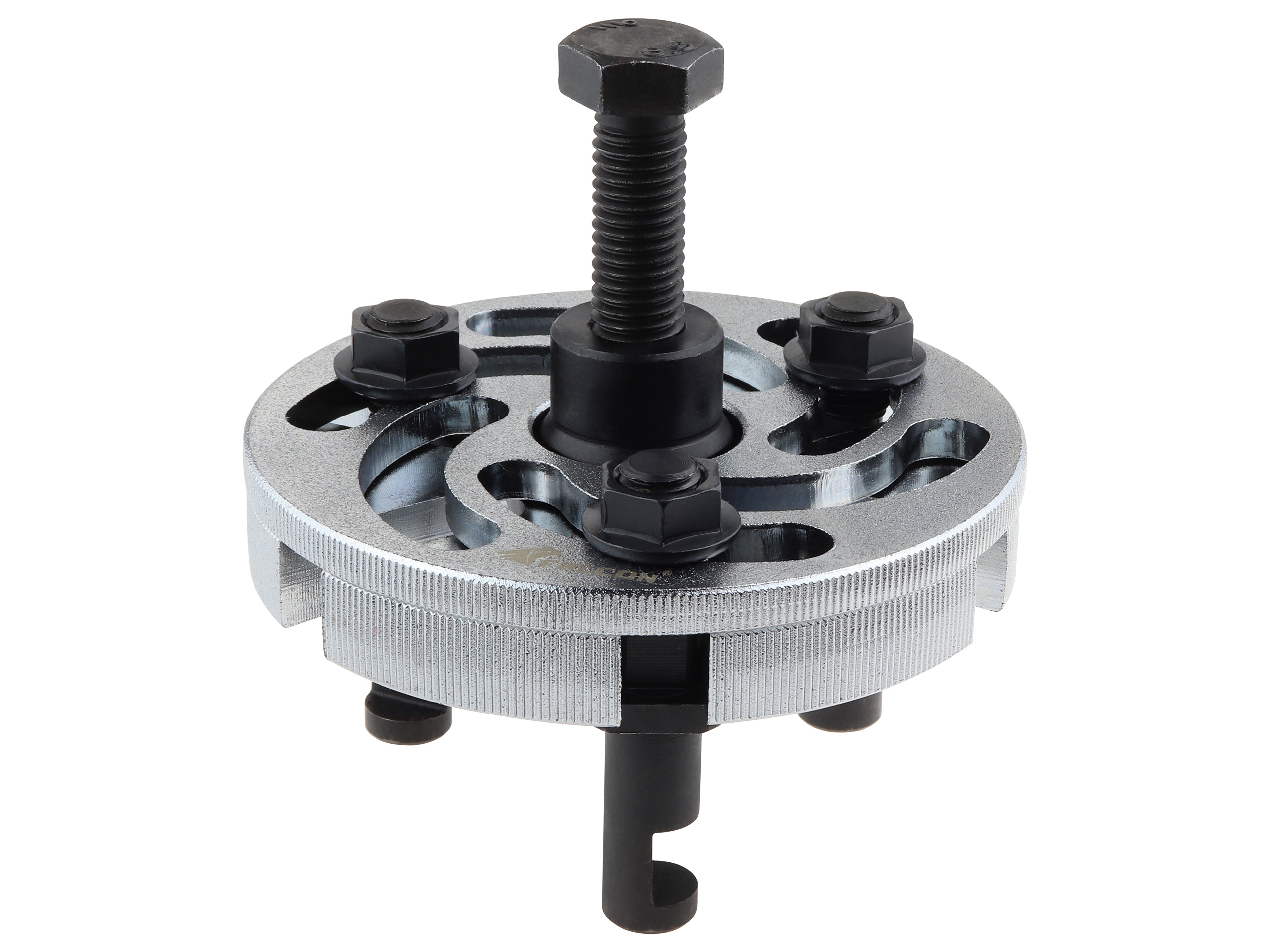 Профессиональный, универсальный съемник шкивов грм, водяного насоса, кондиционера, позволяет захватить ременной шкив с их отверстия, поворотные рукоятки позволяют подобрать различных диаметров и три ручки и несколько вариантов их установки делают съемник является универсальным и универсальный. Универсальное применение, благодаря многопозиционному монтажу лап, позволяет демонтировать большинство зубчатых колес, установленных в труднодоступных местах. Съемник предназначен для снятия шкивов распредвала с передней стороны с отверстиями 3,6 или 9. Использование съемника предотвращает повреждение шкивов. Благодаря регулируемым лапам съемника можно применять его к различным диаметрам. Samocentrujący, компактная конструкция позволяет работать в труднодоступных местах, очень массивный и прочный