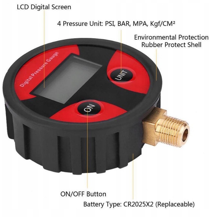 Примечание :1, 1 кгс/см⊃ 2; = 98 кПа 2, нормальное обслуживание автомобиля должно измеряться давление в шинах один раз в месяц. Технические характеристики: Название продукта: датчик давления в шинах материал корпуса: медь + резина размер: 60x260 мм газовая насадка интерфейс: внутренний диаметр 8,5 мм наружный диаметр 6,3 мм Общая длина: 260 мм длина резинового шланга: 200 мм источник питания: 2x встроенный CR2032 4 единицы в наличии: PSI,BAR,KPA, KGF/cm⊃ 2; интуитивно понятный цифровой дисплей. ЖК-экран для удобного чтения. Простота в использовании и переноске. Двойная функция надувания и дефляции. Блокировка давления воздуха / разблокировка сердечника клапана. Он используется для контроля давления в шинах, продления срока службы шин и обеспечения безопасности. Высококачественный цифровой чип, ЖК-монитор, тестирование более точное, более надежное и экономичное. Идеально подходит для автомобилей, мотоциклов, велосипедов, грузовиков и т. д. Когда вы не используете его, он автоматически отключится через 30 секунд. п>