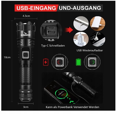 этот перезаряжаемый фонарик с литиевыми батареями 5000 мАч 21700, по сравнению с аккумулятором 5000 мАч 18650, на 50% выше, что обеспечивает длительный срок службы фонарика. Встроенный интерфейс Type-C, зарядка более удобна. с USB-выходным дизайном вы можете зарядить свой мобильный телефон в случае чрезвычайной ситуации. если красный свет загорается на выключателе фонарика, зарядите его соответствующим образом.