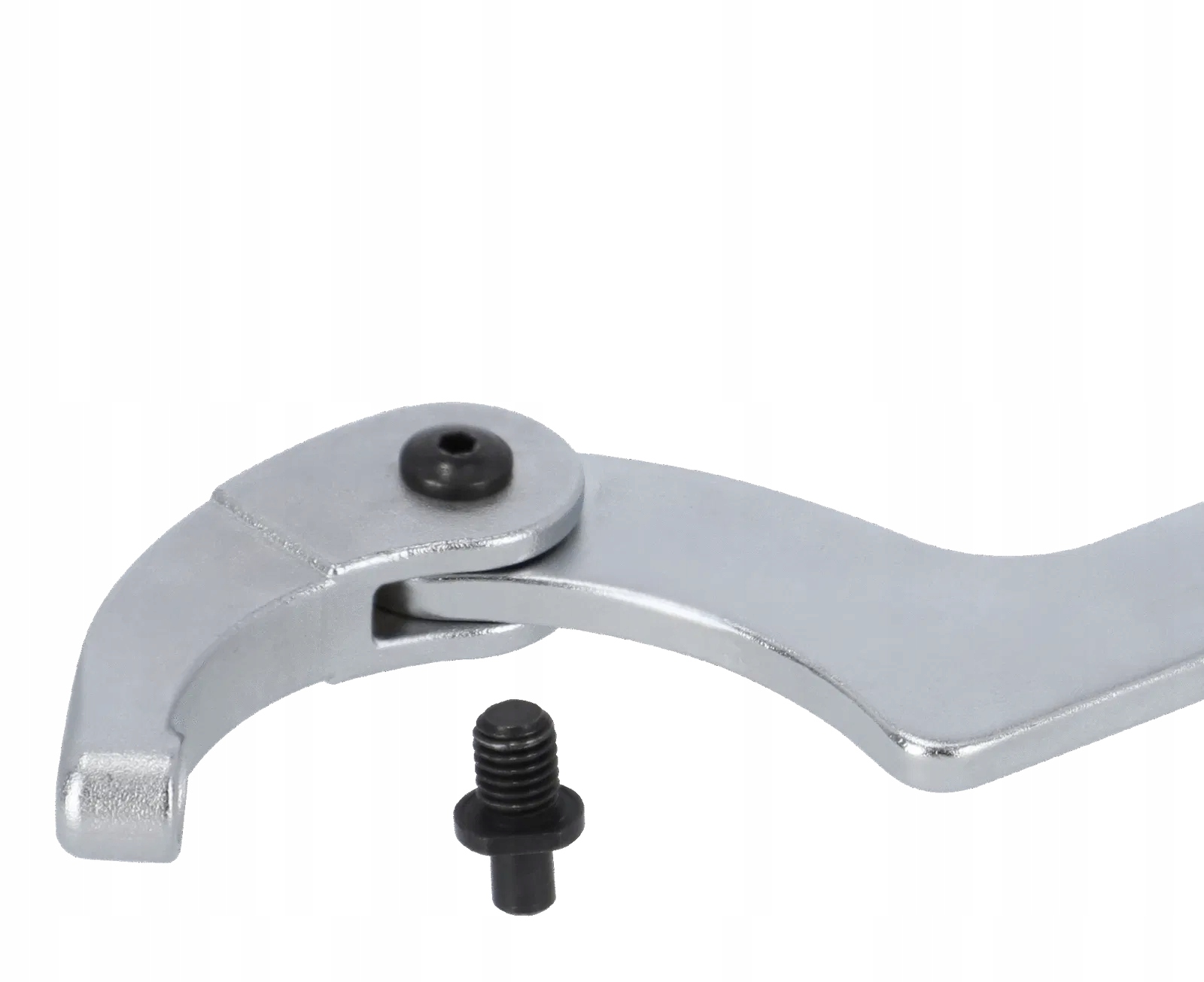 Ключ-крючок с круглым штифтом, шарнирный (регулируемый). Использование шарнира значительно расширяет сферу использования. Для обслуживания фланцев, колец и подшипников. Одиночная подвижная губка на штифте.