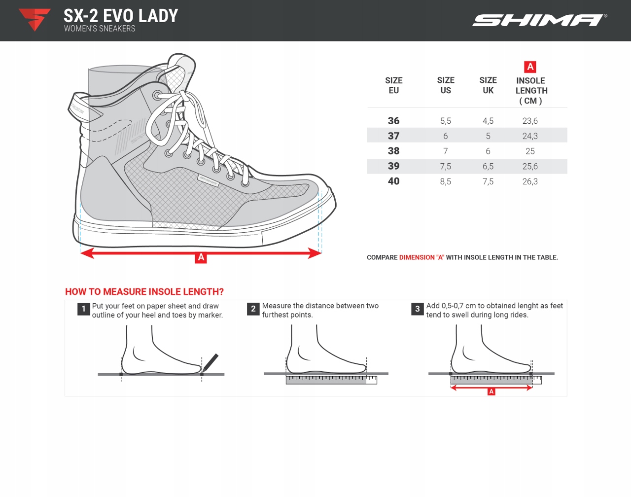 Посмотрите на новый имидж наших самых популярных кроссовок. SX-2 EVO Lady — это качество в сочетании с новым стилем в трех изысканных цветовых вариантах. Эти кроссовки, оснащенные щитками из ТПУ и амортизаторами ArmorPlus с обеих сторон лодыжки, а также закаленными поверхностями носка и пятки, обеспечивают безопасность ваших ног, не ограничивая свободу движений. Перфорированная замша и подкладка из 3D-сетки обеспечивают хорошую воздухопроницаемость и функциональность при повседневном использовании. SX-2 EVO — это больше, чем просто кроссовки, они оснащены ремешком для удобного надевания, а несколько незаметных светоотражающих элементов улучшают видимость в темноте. Специальное тиснение на носке колодки обеспечивает точное управление рычагом переключения передач. Легкие, со шнуровкой и разработанные с учетом требований безопасности, эти кроссовки идеальны для городских поездок на мотоцикле.