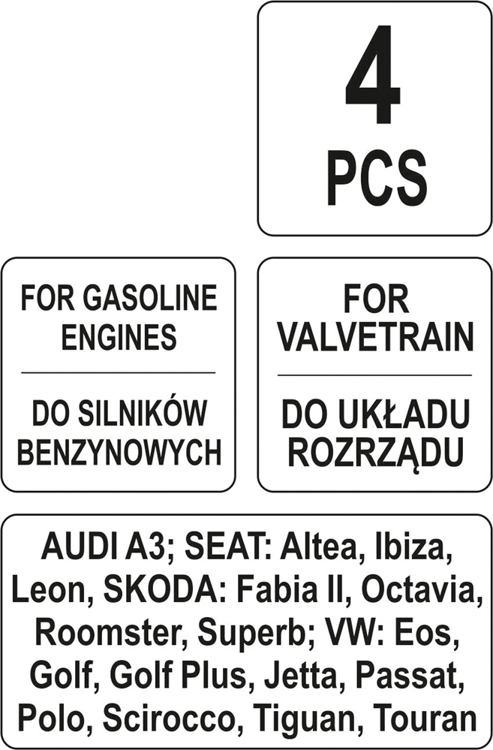 AUDI A3; SEAT: Altea, Ibiza, Leon, SKODA: Fabia II, Octavia, Roomster, Superb; VW: Eos, Golf, Golf Plus, Jetta, Passat, Polo, Scirocco, Tiguan, Touran