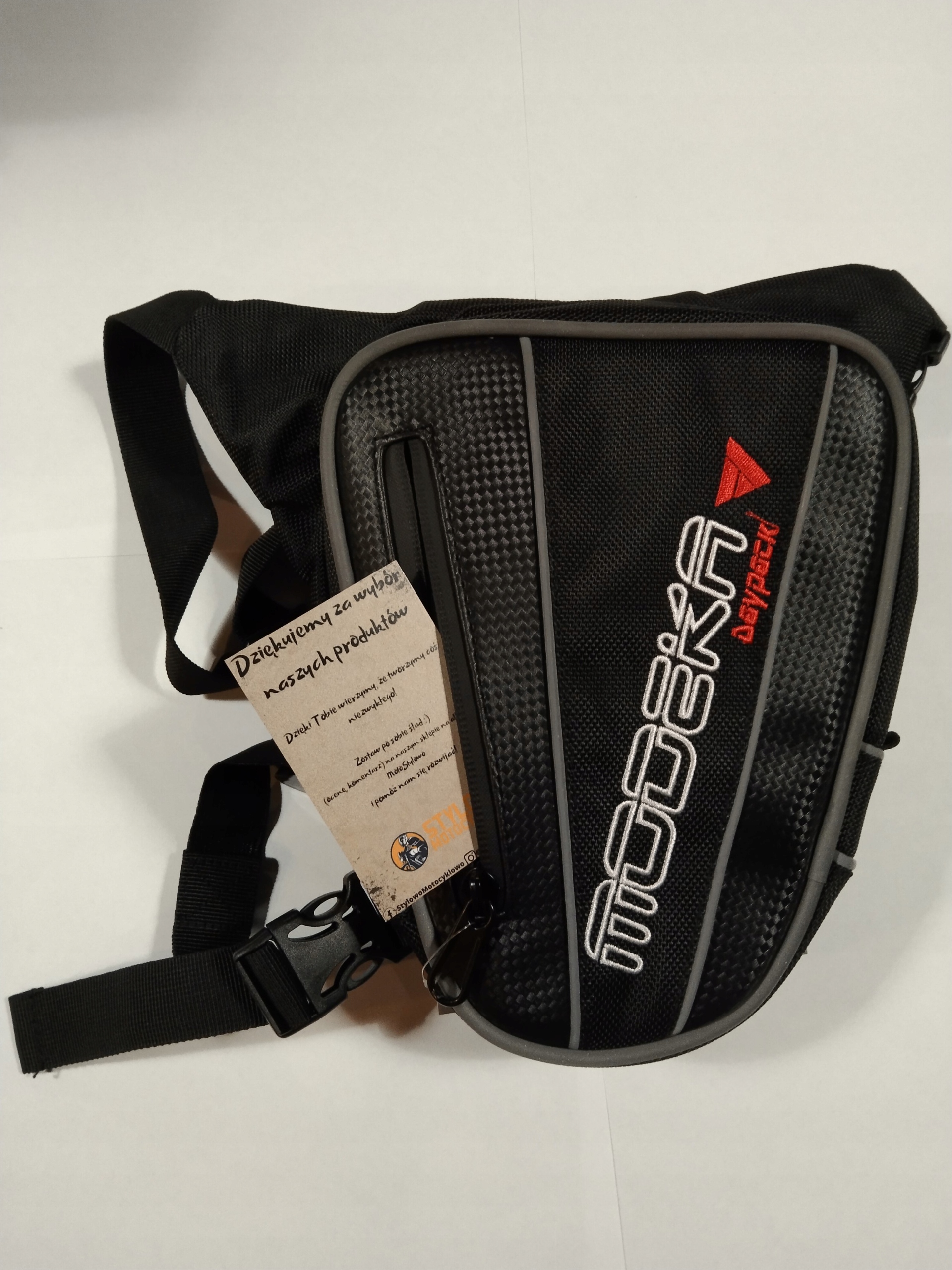 спереди вышита белой нитью надпись MODEKA , рядом также вышит красный логотип бренда MODEKA. Основное отделение открывается на молнию, рядом с которой имеются большие поводки, что облегчает открытие сумки даже в мотоциклетной перчатке. Сумка имеет два крепежных ремня : меньший на бедре и больший на бедре. Оба ремня имеют удобные в обращении защелки.п>