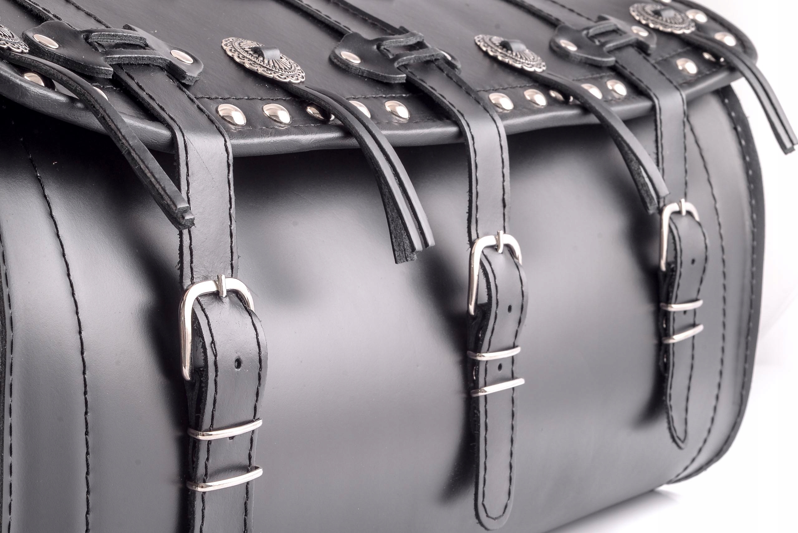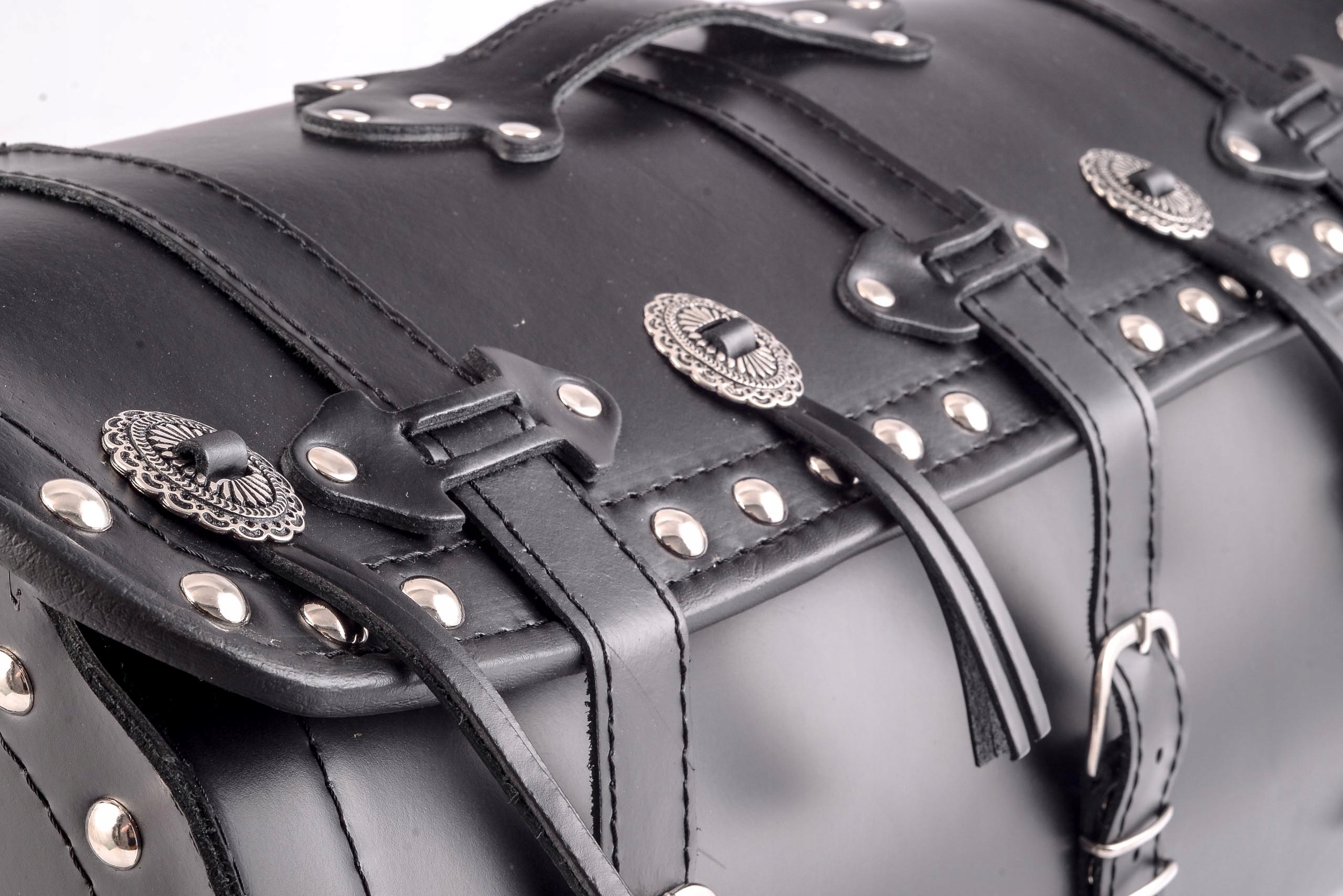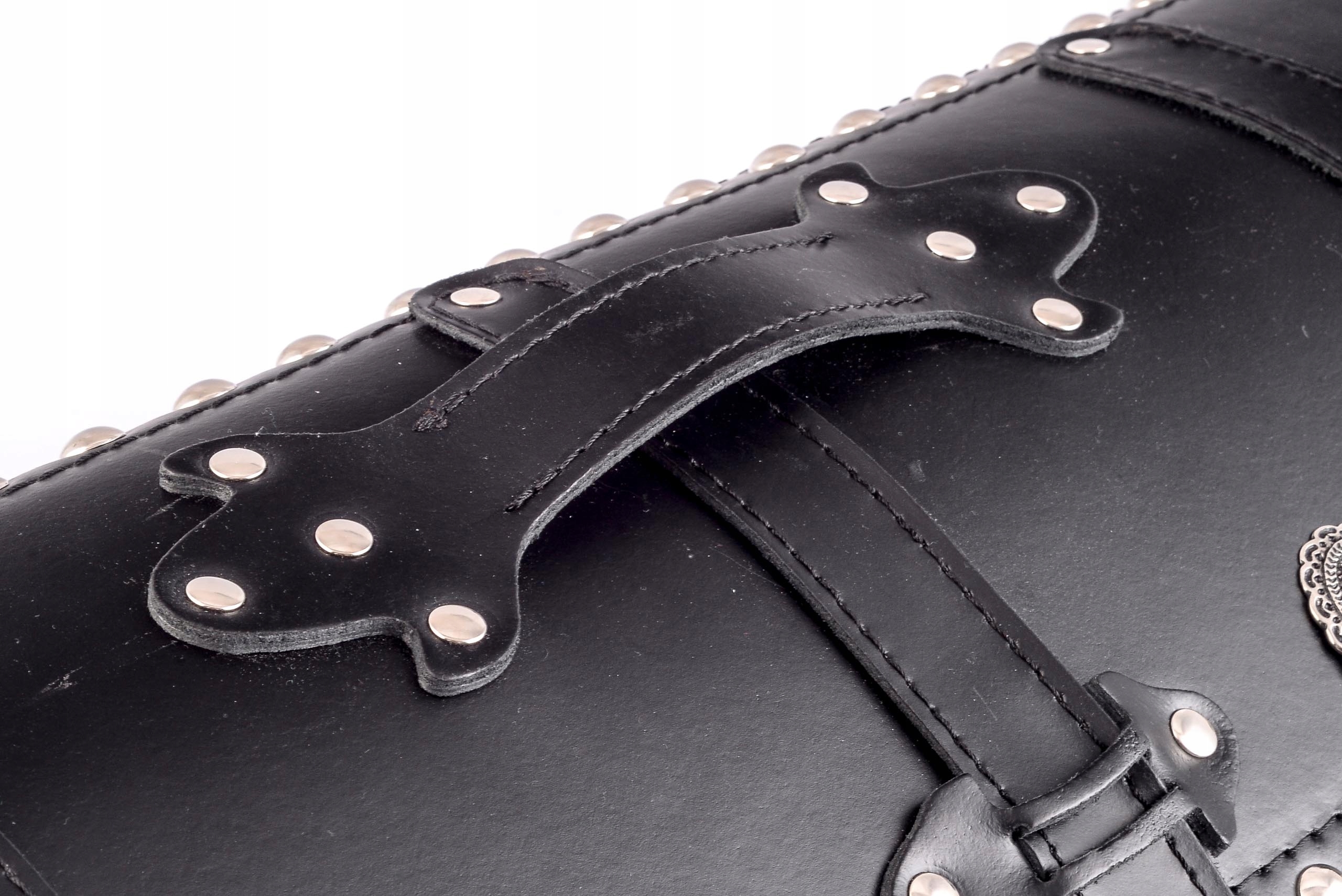 - дополнительно украшен заклепками и отметками с бахромой,