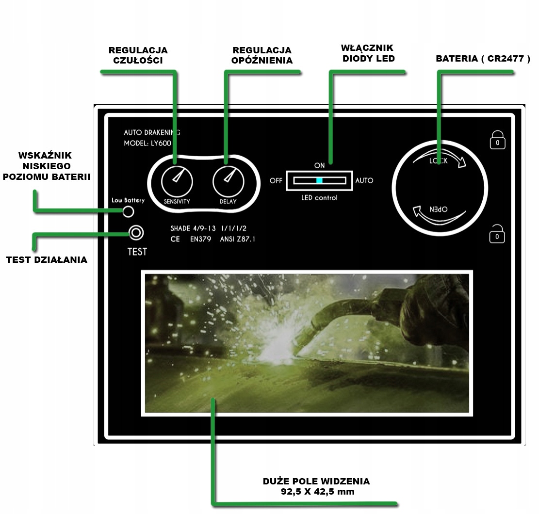 MAGNUM IRON LIGHT оснащен двумя датчиками, повышающими скорость отклика саморегулирующегося фильтра. Он питается от солнечных элементов и съемной батареи. Кроме того, козырек изготовлен из термостойкого износостойкого нейлона, в который не сливаются сварочные сколы.п>