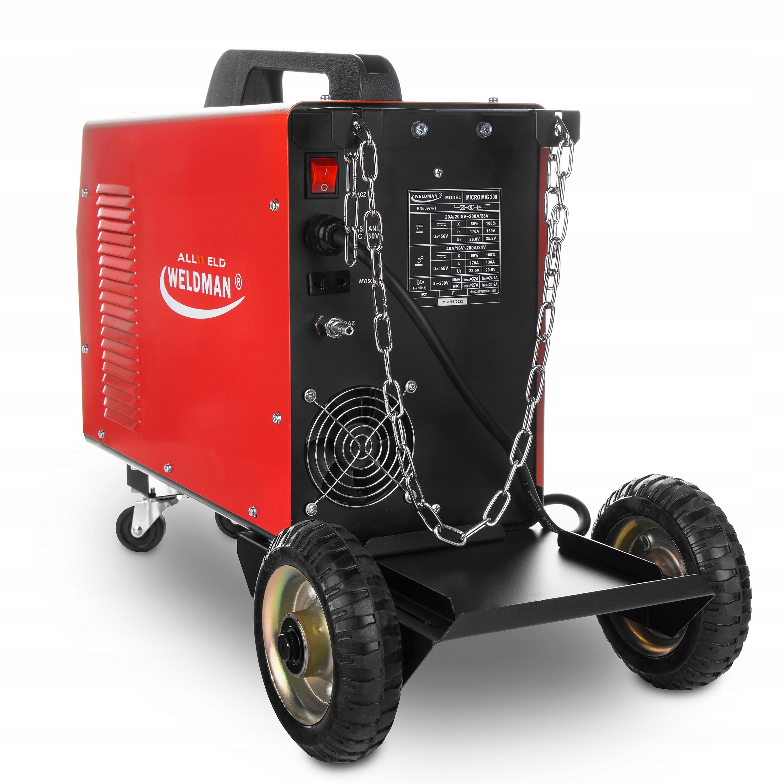 к сварочному аппарату прилагается прочное шасси, на которое можно поставить газовый баллон. Благодаря этому устройство легко перемещается по мастерской. Также стоит обратить внимание на прочную заднюю ось и пару передних колес с торсионной осью, которые обеспечивают стабильность и безопасность при перемещении сварочного аппарата. ходовые колеса прочно изготовлены, что гарантирует их долговечность и надежность. Это делает сварочный аппарат WELDMAN MICRO MIG 200 удобным в использовании и идеально подходит для различных условий эксплуатации.п>