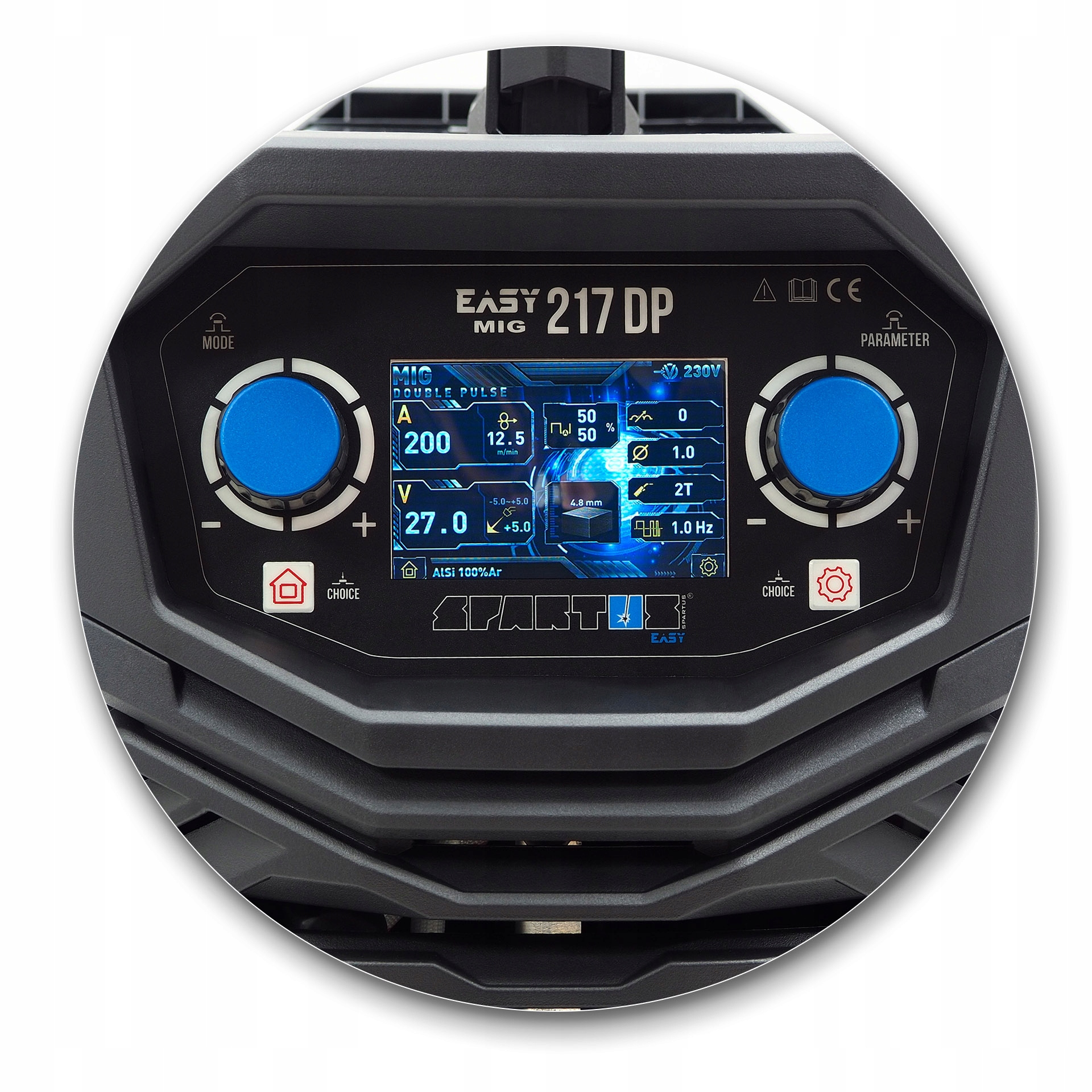 SPARTUS EasyMIG 217 DP - это современный инверторный полуавтоматический сварочный аппарат, построенный на основе IGBT-транзисторов. Позволяет: синергетическая сварка MIG/MAG с двойной пульсацией, синергетическая сварка MIG/MAG с пульсацией, сварка MIG / MAG в синергетическом режиме, сварка MIG/MAG в режиме ручной настройки, сварка Tig Lift, сварка электродом с оболочкой MMA. Кроме того, устройство, благодаря возможности изменения полярности сварки, позволяет выполнять сварку проволокой без газа.