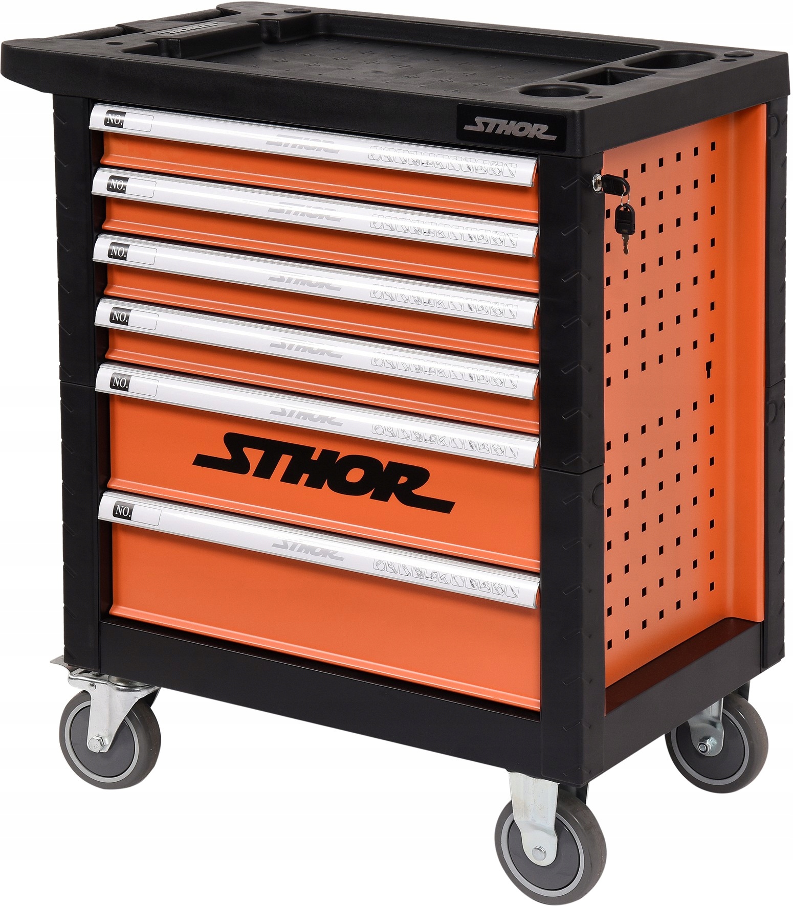 имеет 6 ящиков на шариковых направляющих, оборудованных в 12 пластиковых модулей с инструментами.