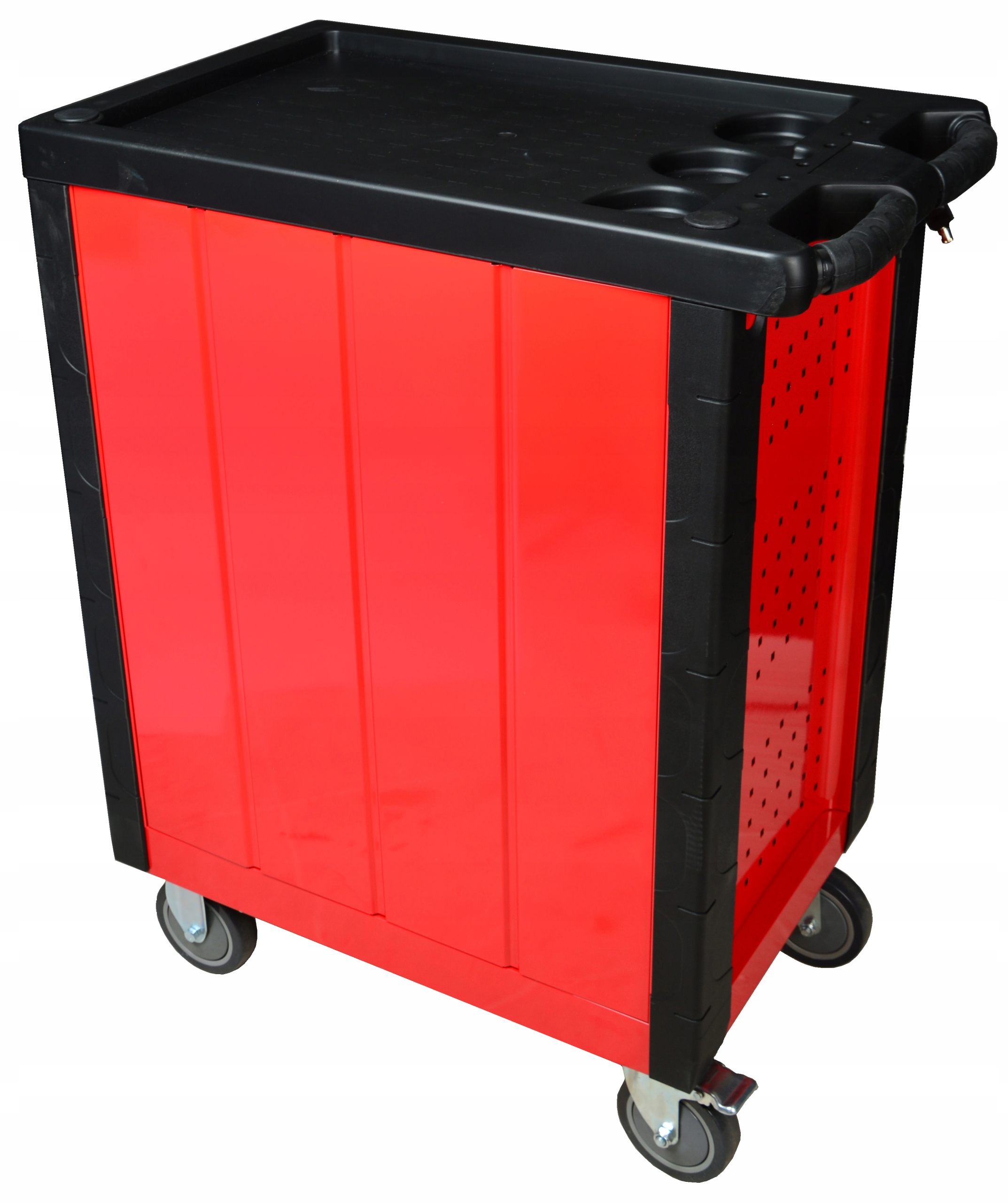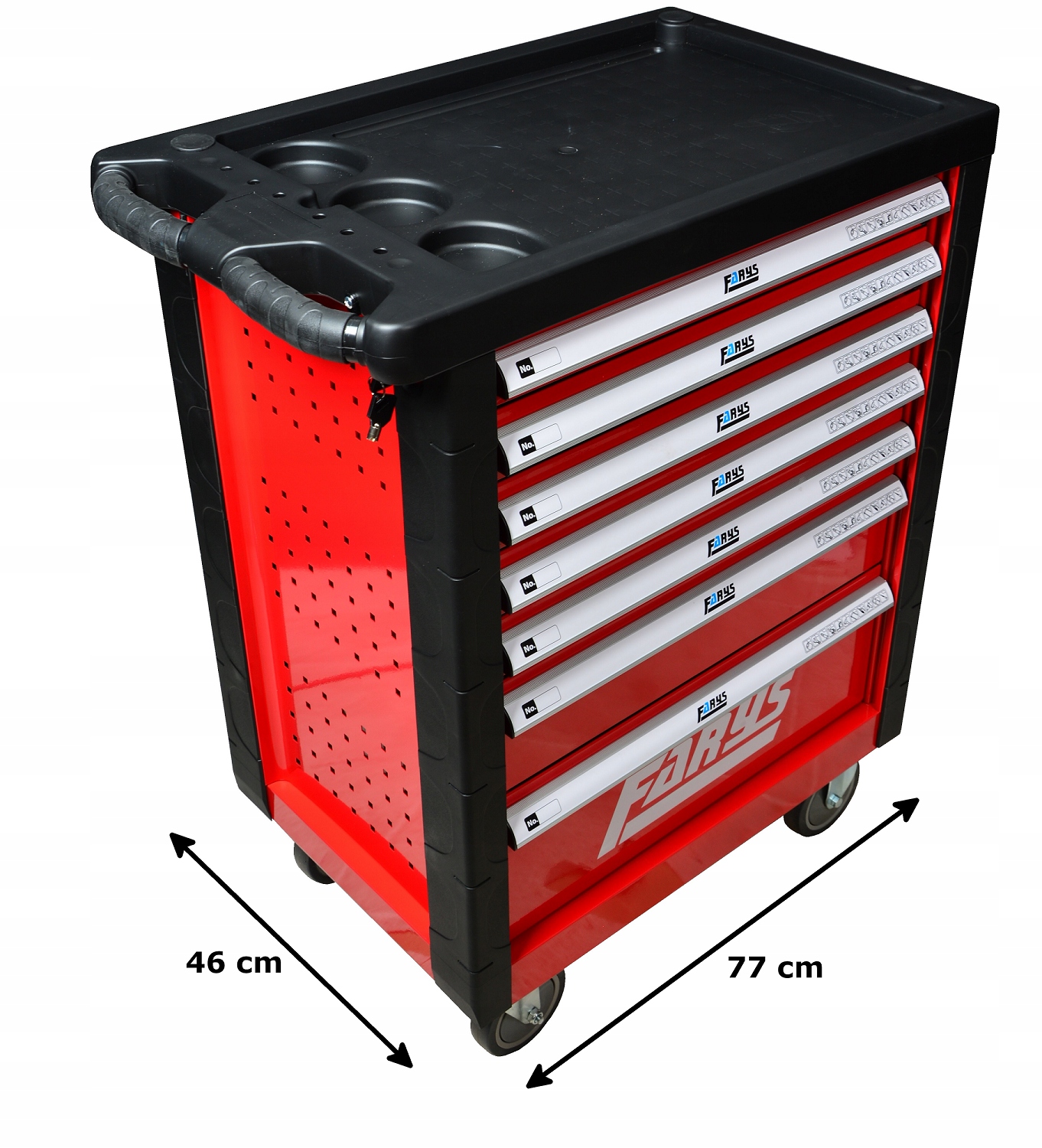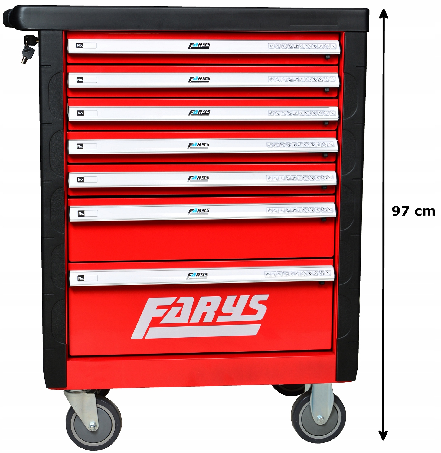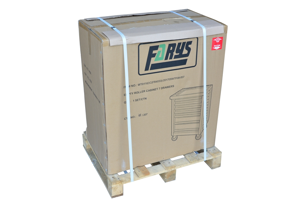 прочная тележка для мастерской с семью ящиками. Ящики имеют направляющие с шарикоподшипниками, центральный замок и замки ящиков. Мобильность тележки обеспечивается четырьмя большими прочными колесами с тормозом.п>